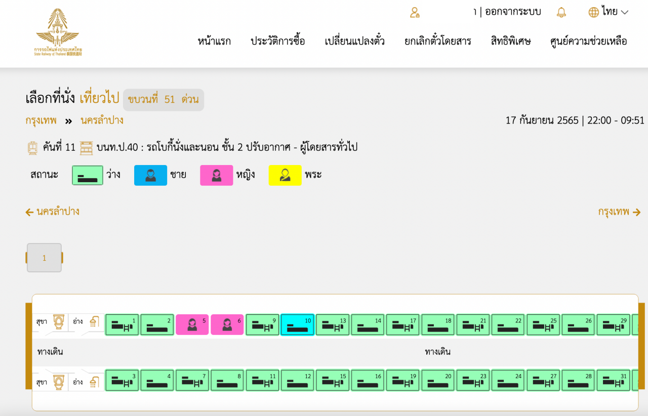 ผู้โดยสารสามารถเลือกที่นั่งได้เอง ไม่ว่าจะเป็น ที่นั่งธรรมดา หรือตู้นอน โดยเลือกจากที่ว่างที่ปรากฏ โดยเครื่องหมายสีเขียว หมายถึงที่ว่าง สีฟ้าหมายถึงมีผู้โดยสารชายจองไว้แล้ว สีชมพูหมายถึงมีผู้โดยสารหญิงจองไว้แล้ว และสีเหลืองหมายถึงที่นั่งพระภิกษุ