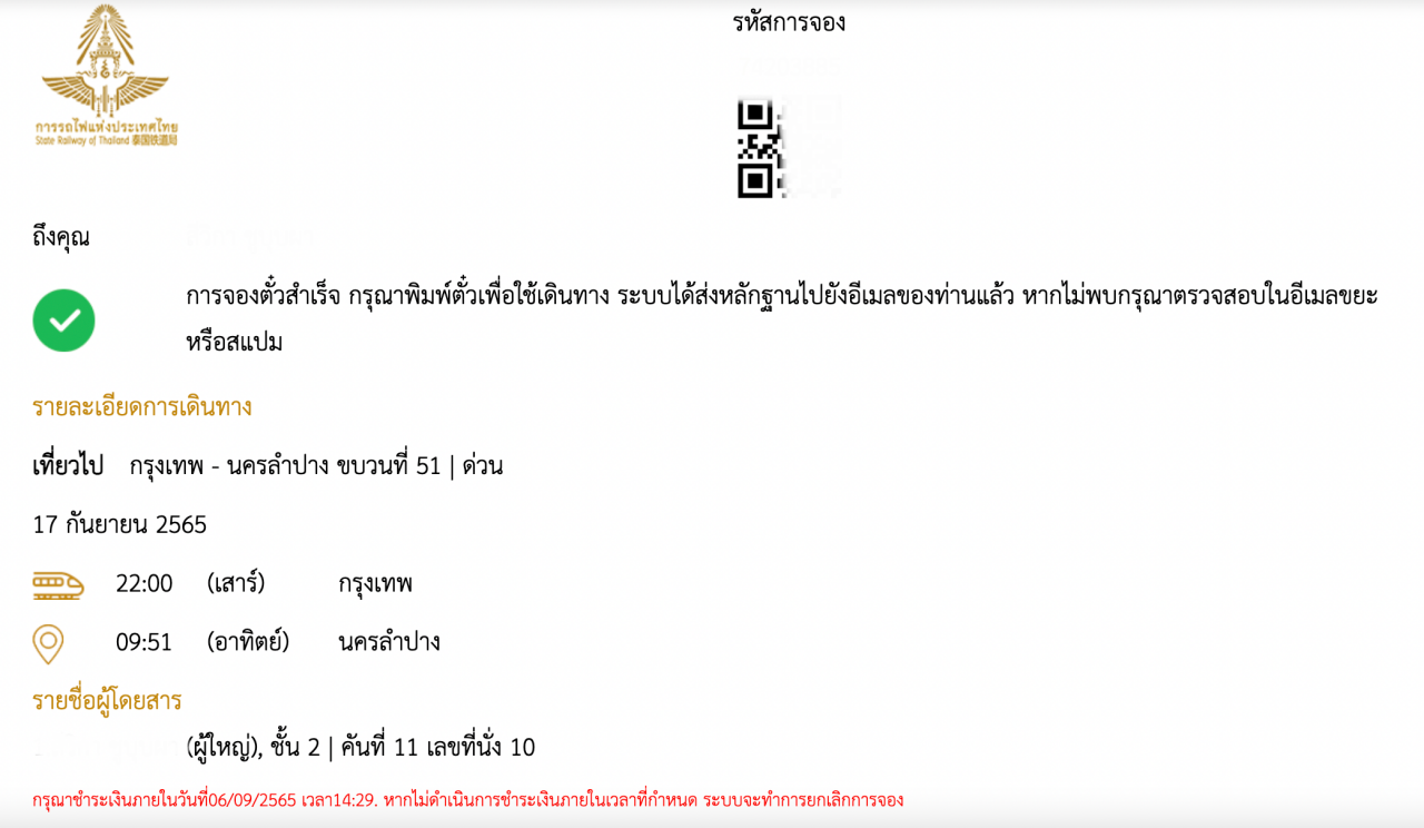 เมื่อจองตั๋วรถไฟสำเร็จ ให้ตรวจสอบข้อมูลให้ถูกต้อง โดยข้อมูลนี้จะส่งไปยังอีเมลอีกครั้งเพื่อเป็นหลักฐาน หากไม่พบอีเมล ให้กดค้นหาที่กล่อง “ถังขยะ” ของจดหมาย หากมีข้อมูลที่ต้องแก้ไขให้ย้อนกลับไปแก้ไขให้สำเร็จ หรือติดต่อเจ้าหน้าที่ เมื่อตรวจสอบเรียบร้อยแล้วก็ไปชำระเงินภายในเวลาที่กำหนด