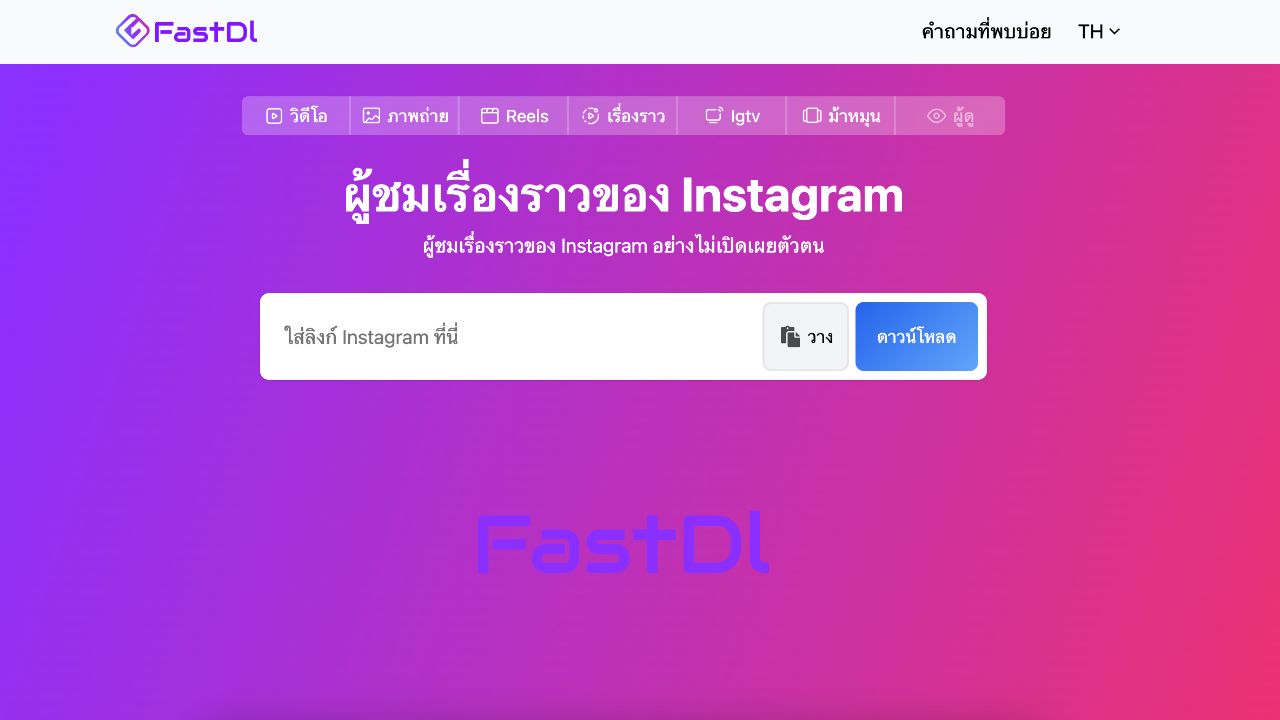 ปิดท้ายด้วยเว็บไซต์ FastDl ที่เปิดให้ใช้งานง่ายๆ เพียงกรอกลิงก์บัญชีไอจี จากนั้นกดดาวน์โหลด ก็จะสามารถดูสตอรี่ไอจี ไฮไลต์ โพสต์ รวมไปถึงคลิปวิดีโอ Reels ได้โดยไม่ระบุตัวตน อีกทั้งยังสามารถดาวน์โหลดเพื่อบันทึกลงอุปกรณ์ของตนเองได้โดยไม่เสียค่าใช้จ่ายอีกด้วย