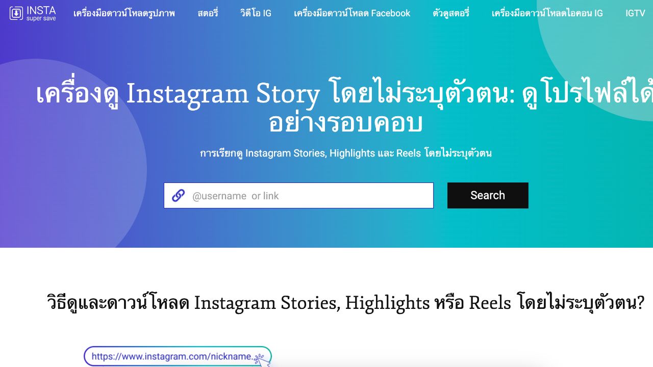 อีกหนึ่งช่องทางส่องสตอรี่ไอจีง่ายๆ เพียงใส่ชื่อบัญชี หรือก๊อบปี้ลิงก์บัญชีมาใส่ในเว็บไซต์ ก็จะสามารถดูสตอรี่ไอจี ไฮไลต์ และคลิปวิดีโอ Reels ได้โดยไม่ระบุตัวตน นอกจากนี้ยังสามารถกดเลือก “ดาวน์โหลด” รอประมวลผล และบันทึกลงเครื่องของตนเองได้อีกด้วย