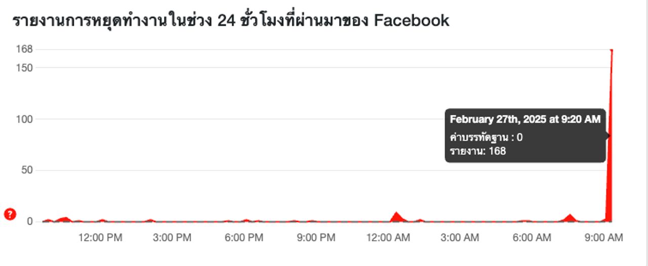 เมื่อดูข้อมูลจากเว็บไซต์ downdetector พบว่า เฟซบุ๊กเริ่มไม่สามารถให้บริการได้ตามปกติในช่วงเวลาประมาณ 9.05 น. จากนั้นในช่วงเวลา 9.20 น. ก็มีการรายงานถึงปัญหาการใช้งานกว่า 168 รายงาน และเพิ่มเป็น 287 รายงานในช่วงเวลา 9.36 น.