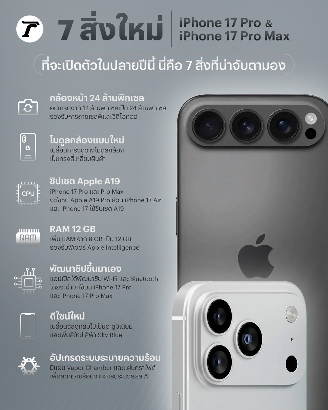 ควรต้องกล่าวด้วยว่า แม้ในปี 2025 แอปเปิลมีแผนที่จะเปิดตัวอีกหนึ่งรุ่นใหม่นั่นคือ iPhone 17 Air ซึ่งเป็นรุ่นบางพิเศษ แต่แอปเปิลก็จะยังคงให้ความสำคัญกับ iPhone 17 Pro และ Pro Max ซึ่งเป็นรุ่นเรือธง โดยคาดว่าจะมี 7 สิ่งใหม่จะเกิดขึ้นสำหรับไอโฟนทั้งสองรุ่นนี้