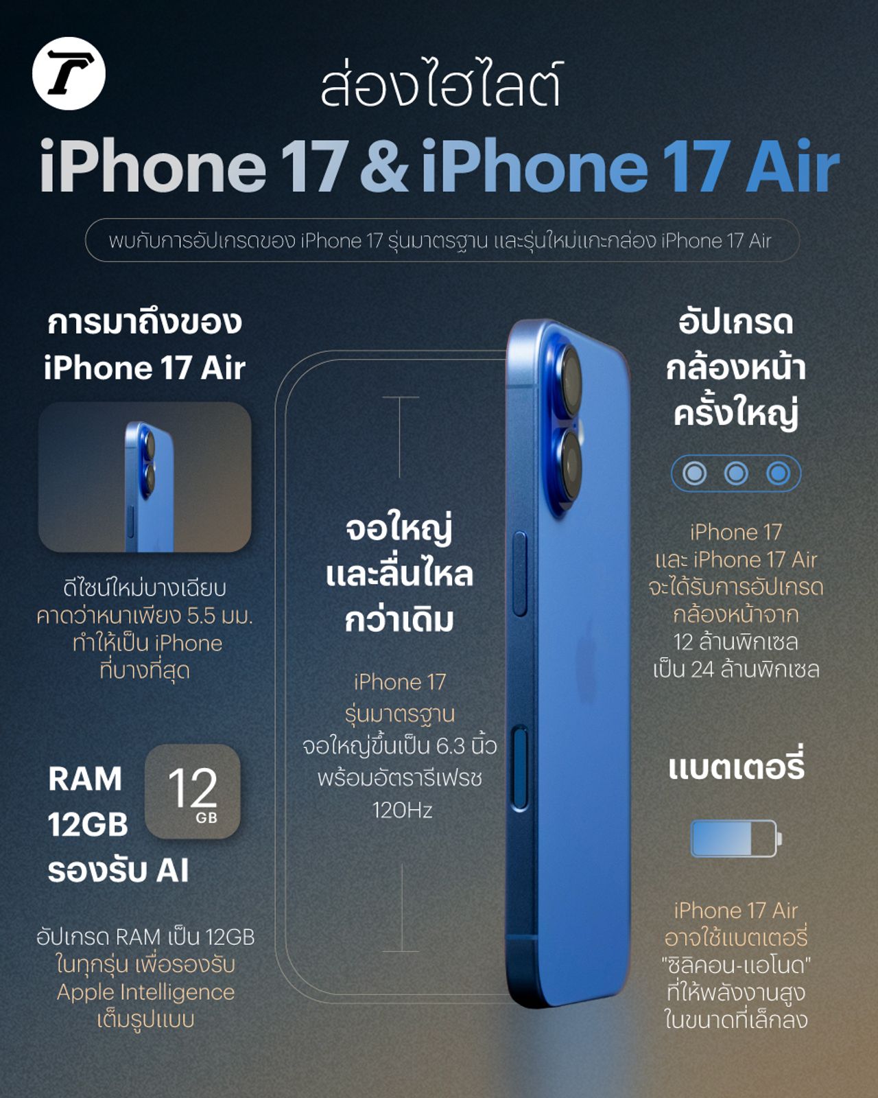 iPhone 17 มีอะไรใหม่ : แม้ว่าการเปิดตัว iPhone ในช่วงหลังอาจสร้างความตื่นเต้นได้ไม่เท่าที่เคย ด้วยการเปลี่ยนแปลงที่ดูเหมือนจะน้อยลงในแต่ละปี แต่สำหรับปี 2025 ดูเหมือนว่าแอปเปิลเตรียมเซอร์ไพรส์ที่น่าสนใจไว้บ้าง โดยเฉพาะอย่างยิ่งกับ iPhone 17 และ iPhone 17 Air รุ่นใหม่แกะกล่อง แม้การเปลี่ยนแปลงครั้งใหญ่อาจยังไม่เกิดขึ้น แต่ก็มีหลายจุดที่น่าจับตามอง ทั้งกล้องหน้า ขนาดจอที่ใหญ่ขึ้น และวัสดุตัวเครื่อง