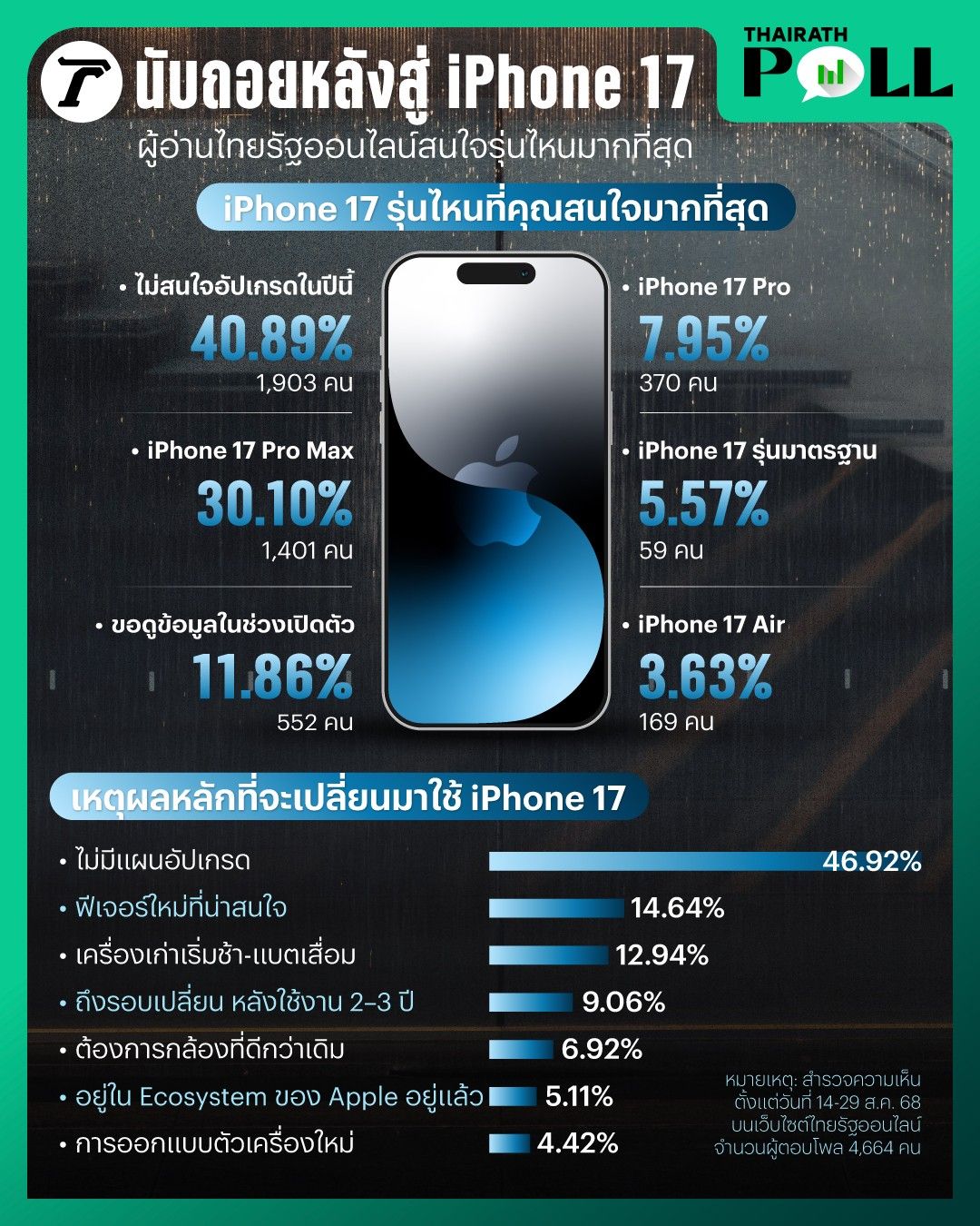 ในโพลนี้มีผู้อ่านไทยรัฐออนไลน์แสดงความคิดเห็นกว่า 4,600 คน จากผู้เห็นโพลมากกว่า 1.55 ล้านครั้ง ซึ่งสะท้อนให้เห็นภาพรวมทิศทางความสนใจของผู้บริโภคชาวไทยและผู้อ่านไทยรัฐออนไลน์มีต่อ iPhone 17