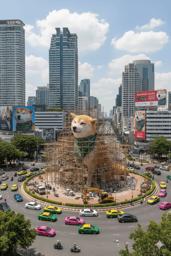 “สร้างภาพใหม่ เป็นรูปปั้นบุคคลในรูป @img1 ลักษณะคงเดิม 100% ขนาดใหญ่กลางกรุงเทพฯ,ปรับผิวสกินโทนให้เหมาะกับแสง,สีสมจริง ,คนงานก่อสร้างมากมายกำลังช่วยกันสร้างบนนั่งร้านไม้ไผ่สูง,มีรถก่อสร้าง ,ถนนวงเวียนมีรถสัญจรไปมา , อากาศสดใสมีเมฆ, ภาพถ่ายมืออาชีพด้วยกล้อง DSLR fullframe,ตึกมากมาย,ต้นไม้ , มีป้ายไวนิลจากรูป ref @img1 ขนาดใหญ่ อยู่ 2-3 ป้าย , แสงทั้งรูปสว่างสดใสสมจริง”