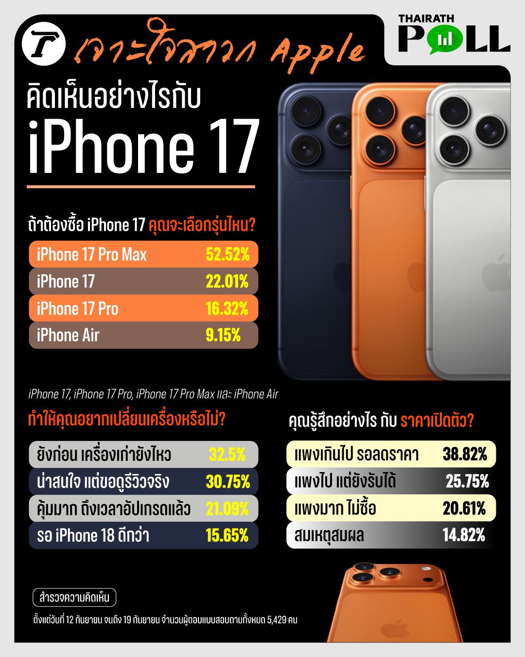 แบบสำรวจ “เจาะใจสาวก Apple คิดเห็นอย่างไรกับ iPhone 17” ของไทยรัฐออนไลน์ ซึ่งมีผู้ร่วมตอบรวม 5,429 คน ได้สะท้อนทิศทางความต้องการไปที่ iPhone 17 Pro Max ขณะที่การตัดสินใจซื้อหรือไม่นั้น ยังขึ้นกับ ราคา และการรีวิวการใช้งานจริง