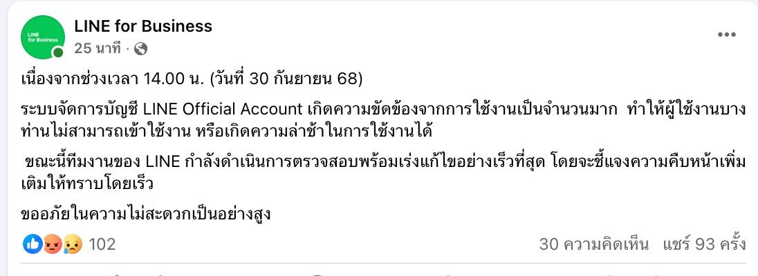 “เนื่องจากช่วงเวลา 14.00 น. (วันที่ 30 กันยายน 2568) ระบบจัดการบัญชี LINE Official Account เกิดความขัดข้องจากการใช้งานเป็นจำนวนมาก ทำให้ผู้ใช้งานบางท่านไม่สามารถเข้าใช้งาน หรือเกิดความล่าช้าในการใช้งานได้
