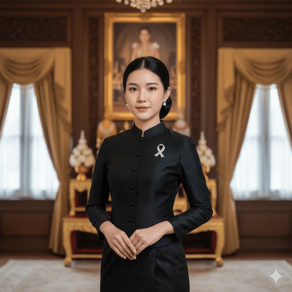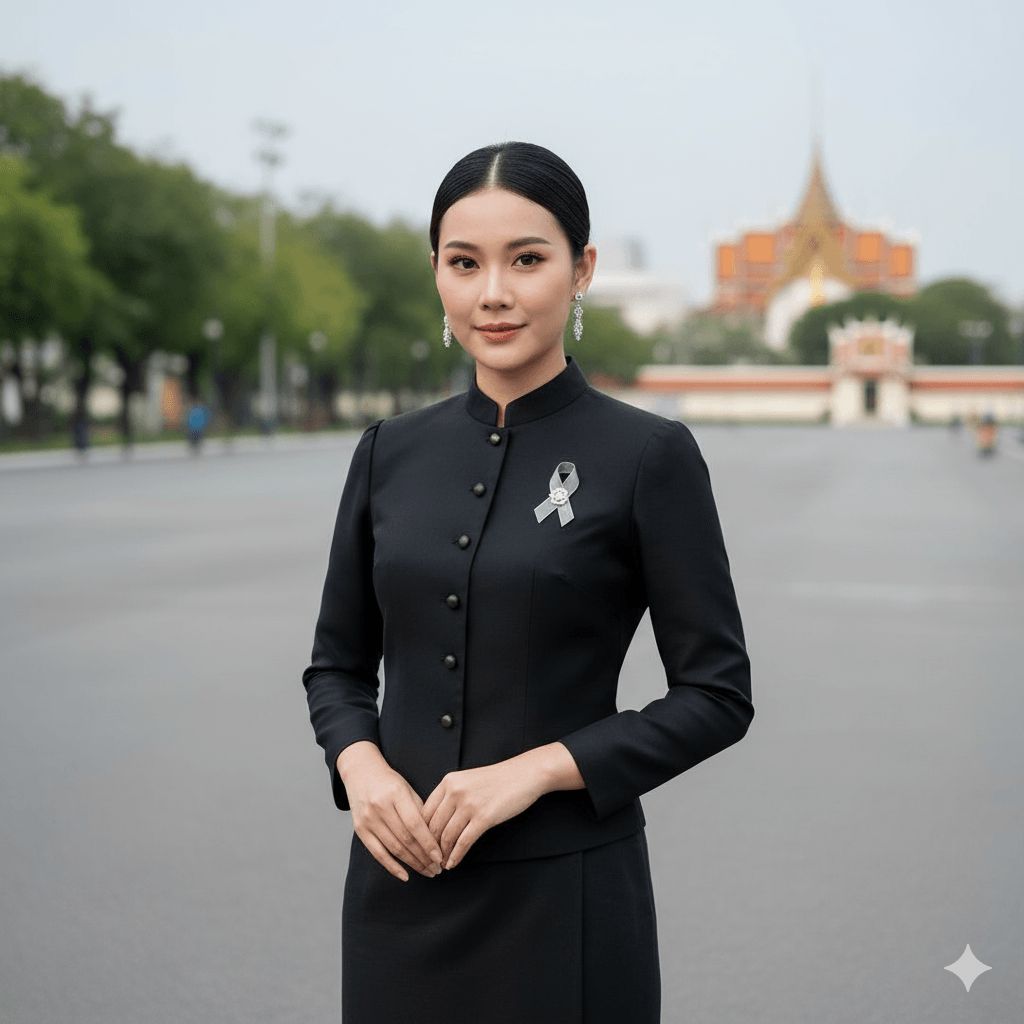 5. สร้างภาพถ่ายบุคคลสมจริง คงใบหน้าเดิม 100% สวมชุดไทยจิตรลดา สีดำเสื้อแขนยาวจิตรลดาคอจีนเรียบหรู มีกระดุม เป็นชุดที่ดูสง่างาม มิดชิด เหมาะสำหรับงานพิธีใหญ่ งานพระราชพิธี รัฐพิธี งานหมั้น หรืองานฉลองมงคล ใส่ต่างหูเข้ากับชุด ติดเข็มกลัดริบบิ้น แต่งเพชร ไว้อาลัย หน้าอกด้านซ้าย ยืนอย่างสวยสง่า ทรงผมเกล้าผมเรียบร้อย แต่งหน้าโทนชมพูระเรื่อ, ภาพคมชัดแบบ 4K ภาพดูสมจริงโพสต์ท่าตรงมือประสานกัน, Canon EOS R5, เลนส์ 85 มม. f/1.2, รูรับแสง f/1.2, DOF ตื้นพิเศษ, ฉากหลังเป็นสนามหลวง, ผิวพอร์ซเลนเปล่งประกาย, สุนทรียศาสตร์แฟชั่นที่เน้นรายละเอียดอย่างพิถีพิถัน, อัตราส่วนภาพ 3:4 --ไฮเปอร์เรียลลิสม์ เห็นเต็มตัว
