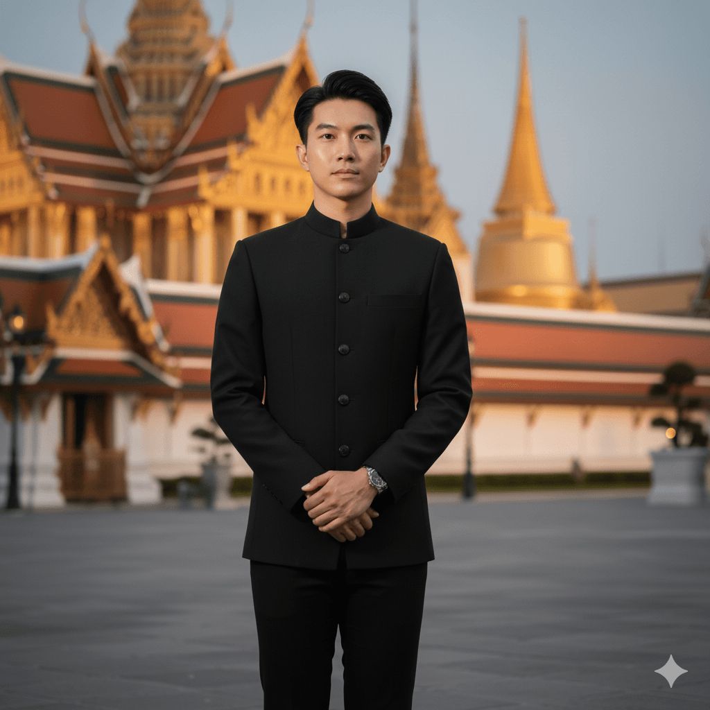 8. สร้างภาพถ่ายบุคคลตามไฟล์แนบ ใบหน้าเหมือนเดิม 100% สวมสูทแขนยาวสีดำแบบทางการ หรือเสื้อทรงไทยลายราชที่ตัดเย็บอย่างประณีต ปกคอจีนสูง กระดุมติดเรียงยาวลงมาด้านหน้า เนื้อผ้าดูเรียบเนียนและสง่างาม เสริมความเคร่งขรึมให้กับชุดของเขา สวมกางเกงสแลคขายาวสีดำ รองเท้าคัทชูหนังสีดำเงา ผมของเขาถูกจัดแต่งอย่างเรียบร้อยและเป็นทางการ อาจจะหวีเสยไปด้านหลังหรือแสกอย่างประณีต เน้นย้ำถึงกิริยามารยาทที่สุขุม เขาไม่สวมเครื่องประดับที่มองเห็นได้ชัดเจน คงไว้ซึ่งความงามแบบมินิมอลและสุขุม ใบหน้าของเขาดูสงบนิ่ง สะท้อนถึงสภาวะแห่งความเคารพและใคร่ครวญอย่างลึกซึ้ง