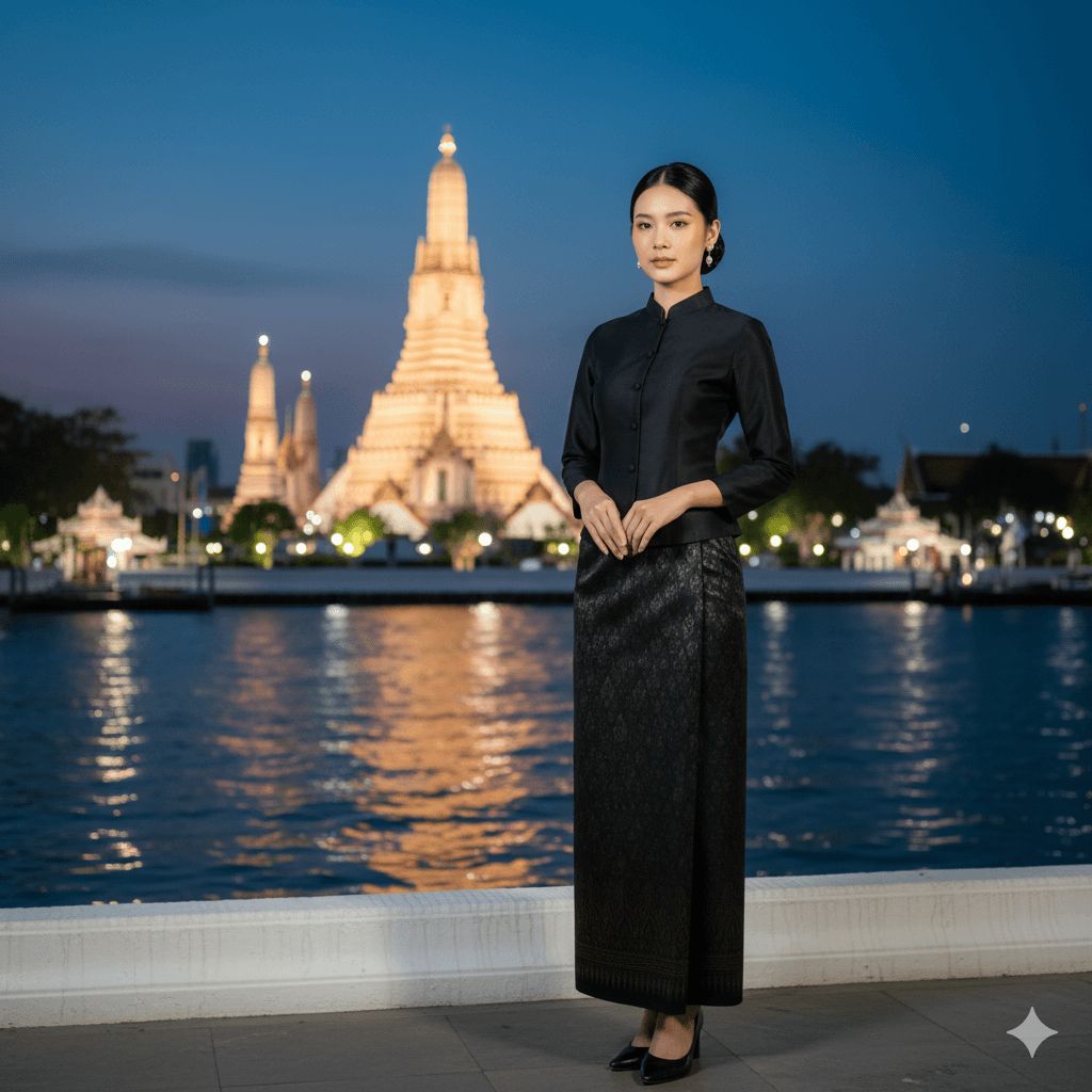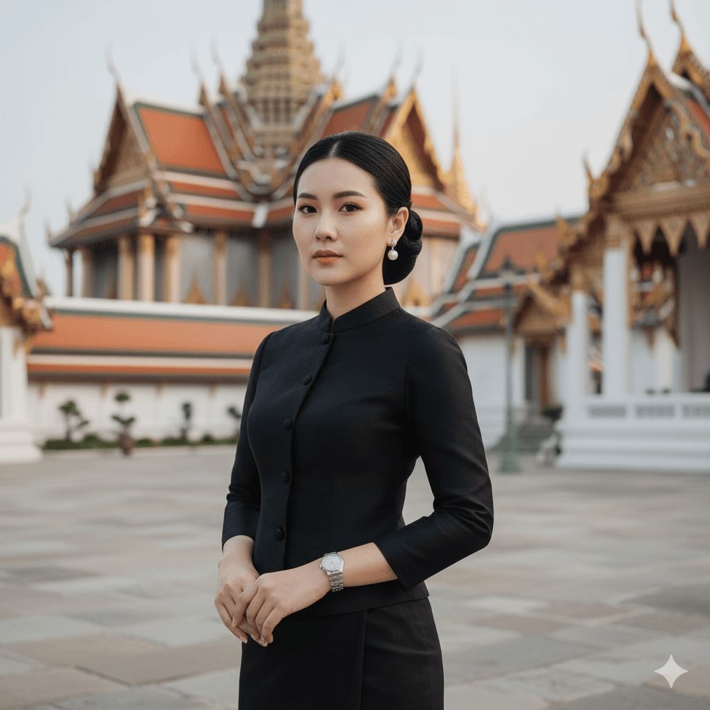 1. สร้างภาพใส่ชุดไทยจิตรลดา สีดำเสื้อแขนยาวคอจีนเรียบหรู มีกระดุม เป็นชุดที่ดูสง่างาม มิดชิด เหมาะสำหรับงานพิธีใหญ่ งานพระราชพิธี ใช้ใบหน้าเดิม 100% ใส่ต่างหูเข้ากับชุด ผ้าถุงยาวสีดำ รองเท้าคัชชูส้นสูงสีดำ ทรงผมสีดำเกล้ามวยต่ำที่ดูหรูหรา แต่งหน้าโทนชมพูส้มระเรื่อ สวย, ภาพคมชัด 4K ภาพดูสมจริงโพสต์ท่าตรงมือประสานกัน ฉากหลังเป็นอรุณราชวรารามที่มีน้ำและแสงไฟสวยงาม, Canon EOS R5, เลนส์ 85 มม. f/1.2, รูรับแสง f/1.2, DOF ตื้นพิเศษ, พื้นหลังหรูหราเข้ากับชุดไทย, ผิวพอร์ซเลนเปล่งประกาย, สุนทรียศาสตร์แฟชั่นที่เน้นรายละเอียดอย่างพิถีพิถัน, อัตราส่วนภาพ 3:4 --ไฮเปอร์เรียลลิสม์ เห็นเต็มตัว