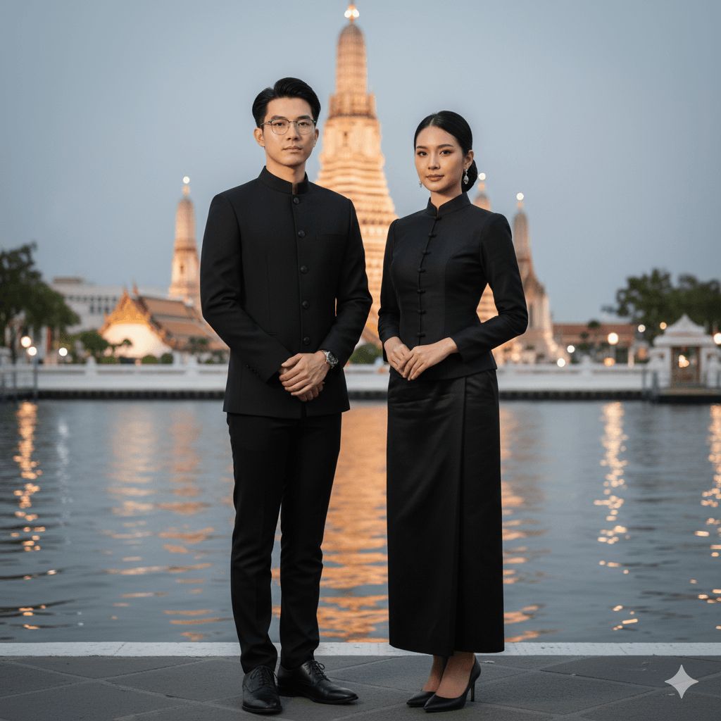 ยืนคู่กับผู้หญิงตามไฟล์แนบ ใบหน้าเหมือนเดิม 100% สวมชุดไทยจิตรลดา สีดำเสื้อแขนยาวคอจีนเรียบหรู มีกระดุม เป็นชุดที่ดูสง่างาม มิดชิด เหมาะสำหรับงานพิธีใหญ่ งานพระราชพิธี ใช้ใบหน้าเดิม 100% ใส่ต่างหูเข้ากับชุด ผ้าถุงยาวสีดำ รองเท้าคัชชูส้นสูงสีดำ ทรงผมสีดำเกล้ามวยต่ำที่ดูหรูหรา แต่งหน้าโทนชมพูส้มระเรื่อ สวย