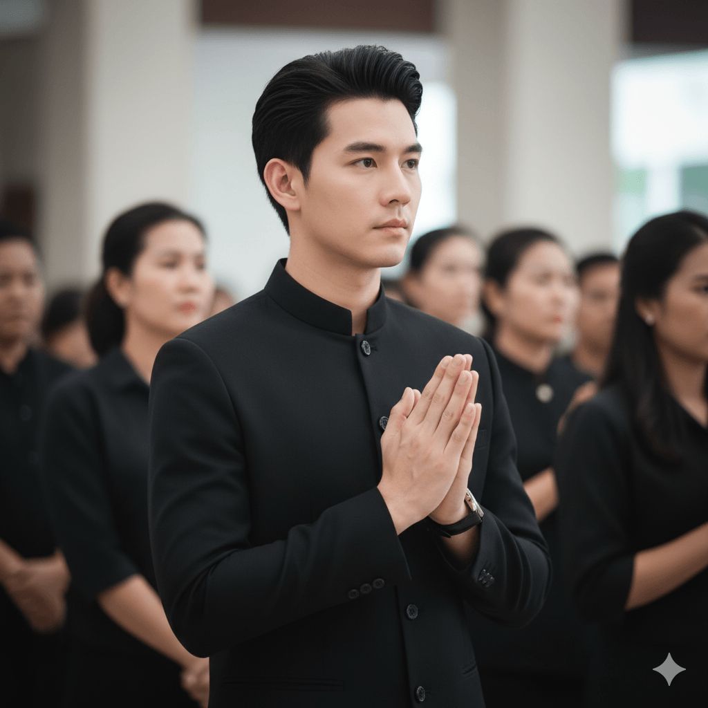 6. สร้างภาพถ่ายบุคคลตามไฟล์แนบ ใบหน้าเหมือนเดิม 100% มีสีหน้าครุ่นคิดและสง่างาม ถูกถ่ายภาพครึ่งตัวจากเอวขึ้นไปในบรรยากาศภายในอาคารที่เคร่งขรึมและน่าเคารพ เขาหันหน้าไปทางขวาเล็กน้อย สายตาจับจ้องไปทางขวาอย่างแผ่วเบา สื่อถึงความรู้สึกครุ่นคิดและความเคารพอย่างลึกซึ้ง มือทั้งสองประสานกันเป็นท่าไหว้ ยกขึ้นอย่างสง่างามที่ระดับอก แสดงถึงการทักทายหรือการแสดงความเคารพตามแบบไทย ซึ่งเหมาะสำหรับโอกาสไว้ทุกข์หรือพิธีการ