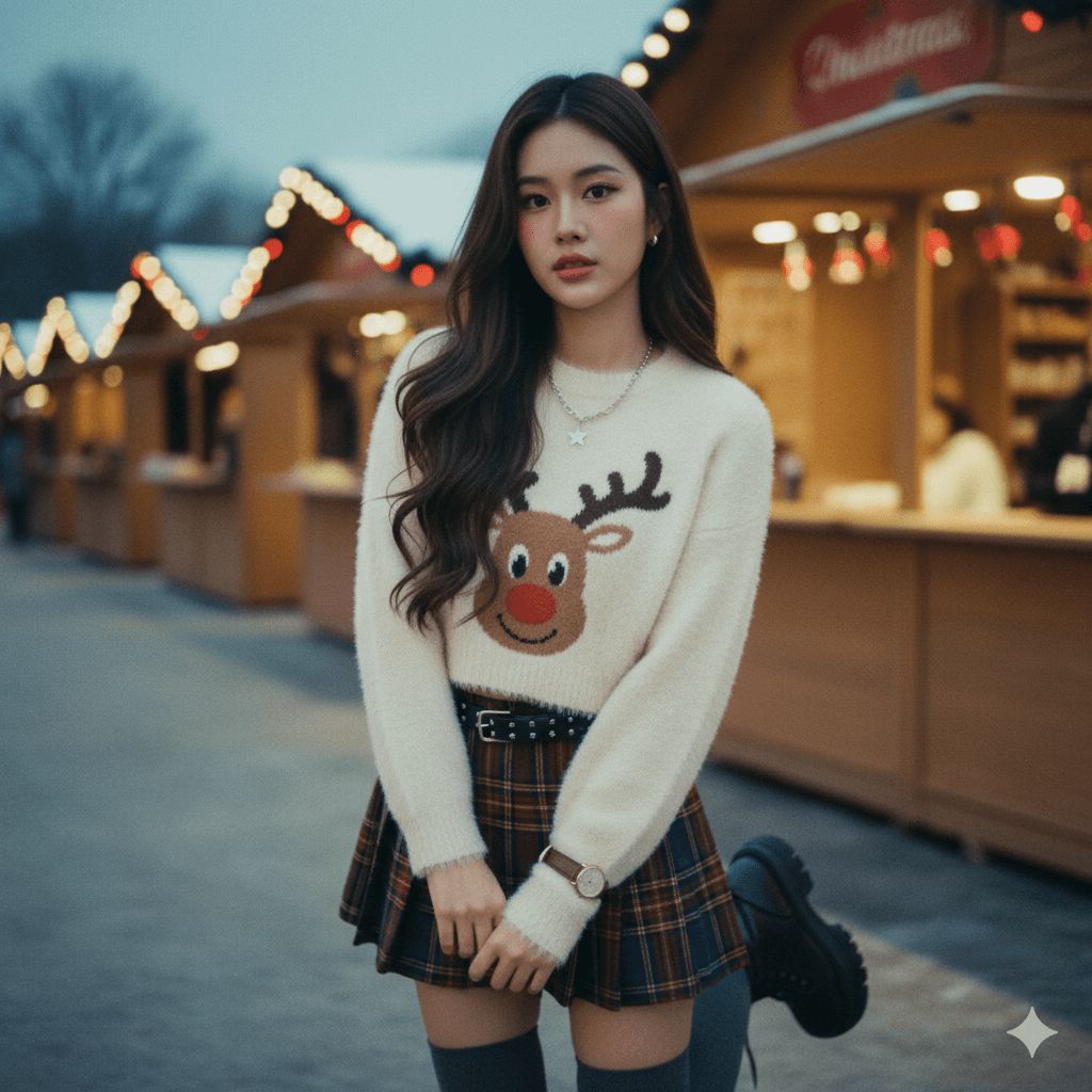 : หญิงสาวยืน โพสท่าน่ารัก เสื้อผ้าธีมวันคริสต์มาส แบบวัยรุ่น