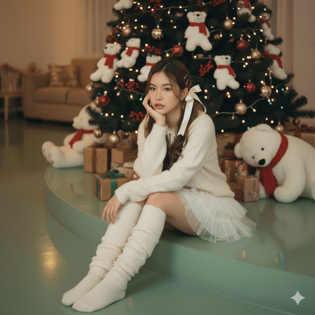 เธอนั่งอยู่บนพื้นโค้งสีเขียวพาสเทลมันวาว ภายในร้านกาแฟบรรยากาศอบอุ่น แสงไฟสลัวๆ ตกแต่งด้วยตุ๊กตาหมีขั้วโลกตัวใหญ่ กล่องของขวัญ และเครื่องประดับคริสต์มาส
