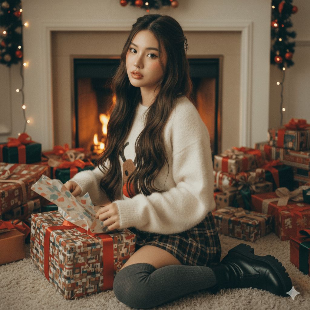มีกล่องของขวัญตั้งอยู่มากมาย เธอกำลังแกะอยู่ 1 กล่อง เสื้อผ้าธีมวันคริสต์มาส แบบวัยรุ่น