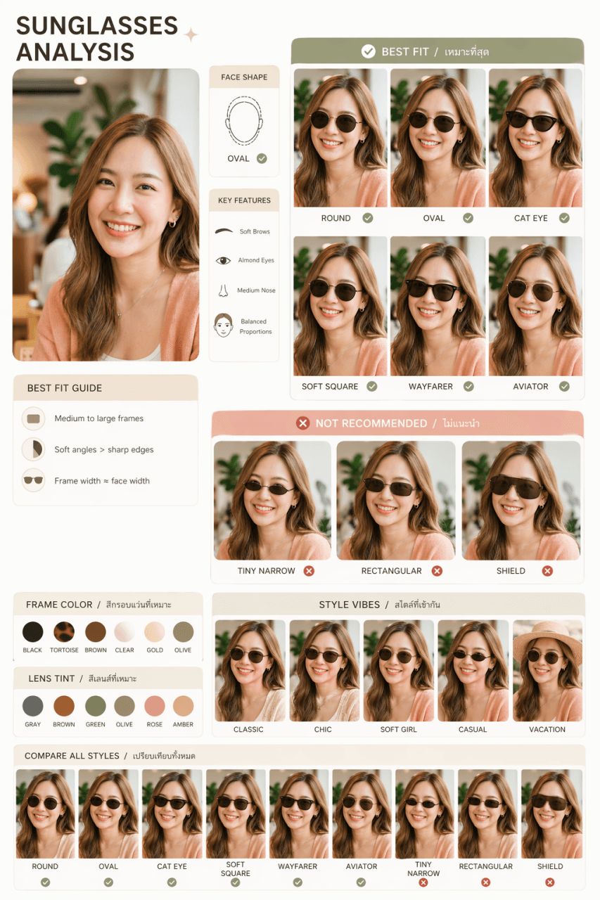 3. ป้อนคำสั่ง “Create a sunglasses analysis graphic using this portrait. Show side-by-side sunglasses comparisons to highlight which sunglasses suit the subject best. Make it visual-first, with short labels only and no paragraphs.”