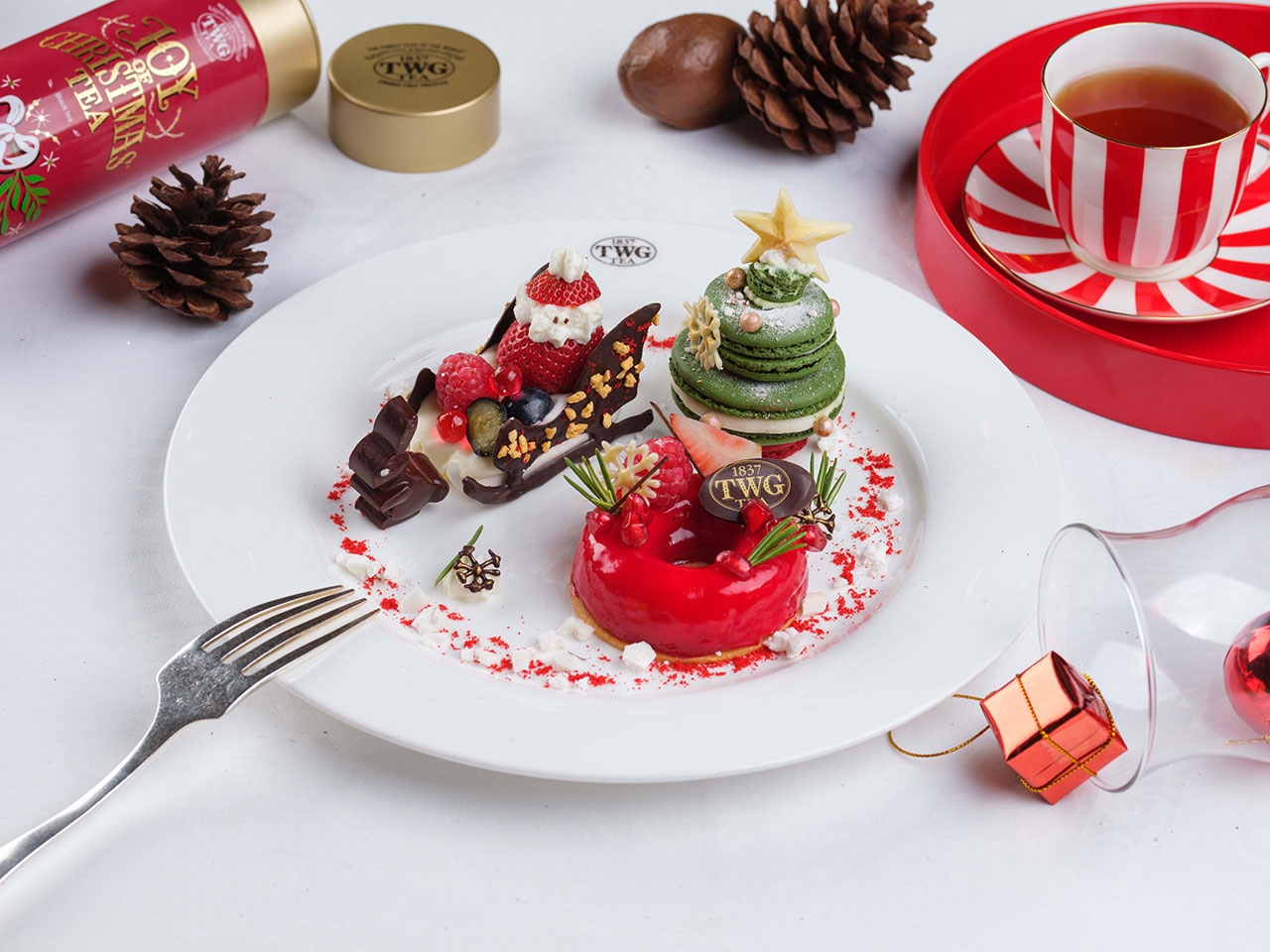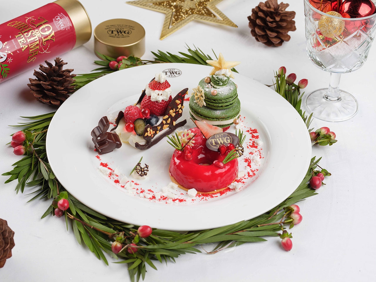 พิเศษสุดสำหรับเทศกาลแห่งความสุขด้วย ลิมิเต็ด เอดิชั่น จอย ออฟ คริสต์มาส ที มาการอง (limited edition Joy of Christmas Tea Macaron) ซึ่งได้รับแรงบันดาลใจจากความแวววาวของเกล็ดหิมะขาว ความฉ่ำของทับทิมสีแดงและสีทองอร่าม ทีดับเบิลยูจี ที (TWG Tea) แปลงโฉมมาการอง ขนมหวานซิกเนเจอร์ให้กลายเป็นอัญมณีชิ้นพอคำที่สามารถรับประทานได้ โดยผสมชา จอย ออฟ คริสมาสต์ ที (Joy of Christmas Tea) ลงไปในมาการองกรุบกรอบผสมอัลมอนด์สีขาวสะอาดก่อนปิดทองบนผิวหน้า จากนั้นบรรจงสอดไส้กานาชสีแดงกำมะหยี่ ที่หอมกลิ่นสับปะรดและเครื่องเทศ เป็นขนมหวานที่เหมาะสำหรับสร้างความสุขสดใสให้กับคนที่คุณรัก