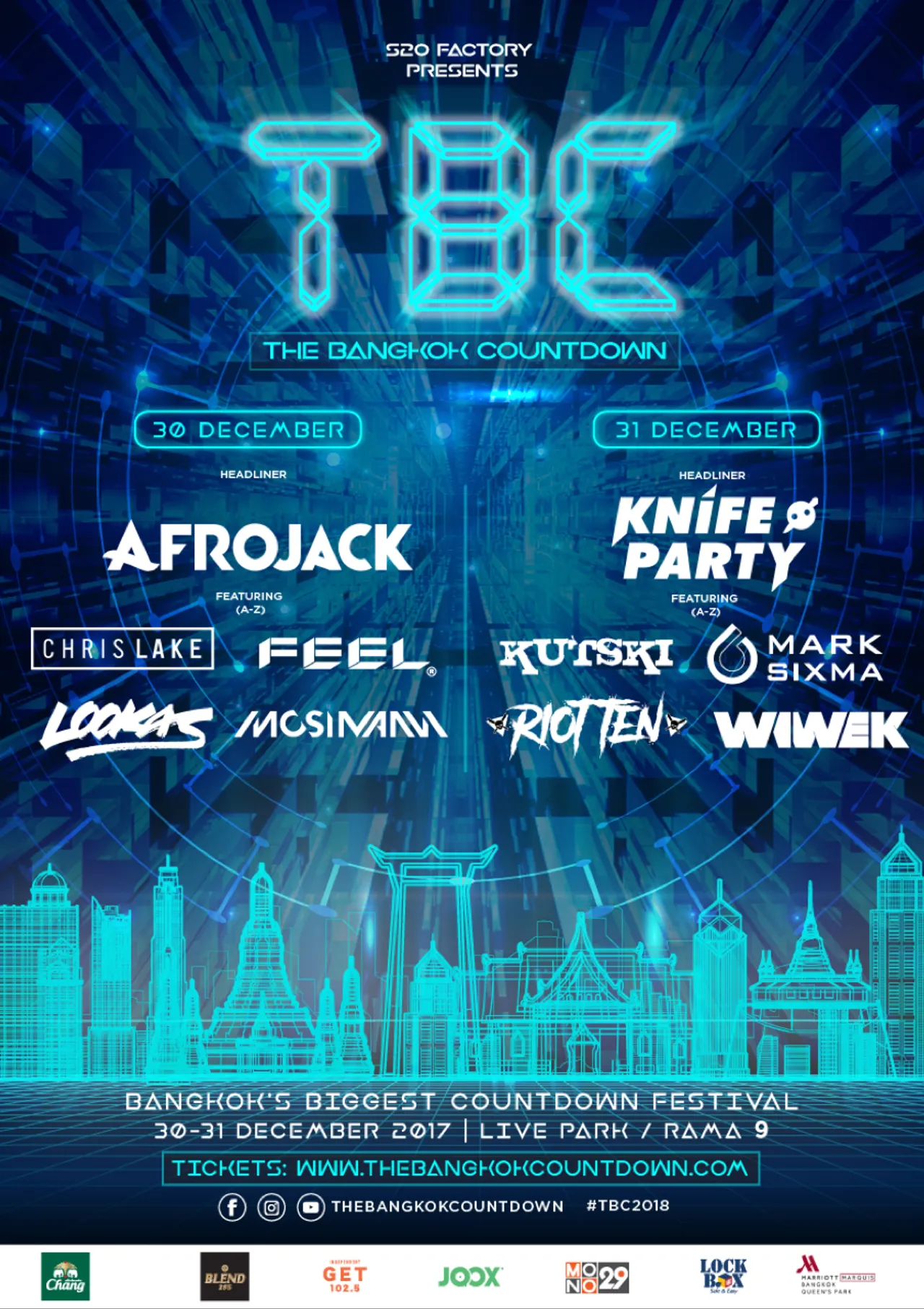 กลับมาระเบิดความมันส์พร้อมเติมความสุขแบบคูลๆ เพื่อส่งท้ายปีเก่าต้อนรับปีใหม่อย่างมีสไตล์กับ TBC ‘THE BANGKOK COUNTDOWN FESTIVAL’ เอาใจชาว EDM เป็นครั้งแรกของประเทศไทย พบกับ Afrojack ดีเจชื่อดังชาวฮอลแลนด์ ติดอันดับที่ 8 ของโลก จากการจัดอันดับของ DJ Mag Top 100 ในปี 2017 และเคยขึ้นเล่นบนเวทีของงานเฟสติวัลระดับโลกมากมาย อย่าง Ultra, Tomorrowland, EDC, Balaton Sound และ Untold เป็นต้น, Chris Lake หนึ่งในดีเจจาก OWSLA เจ้าพ่อเพลงแนว House จากค่ายเพลงอันดับต้นๆ ของอเมริกา, Lookas ดีเจดาวรุ่งติด Top 10 ดีเจที่น่าจับตามองจาก billboard.com, Feel ดีเจ Trance อันดับหนึ่งจากรัสเซีย, Riot Ten ดีเจแนว Trap และ Dubstep และที่ขาดไม่ได้ในคืนเคาต์ดาวน์ยังมีดีเจชื่อดังอย่าง Knife Party ที่ชาวไทยรอคอยมาร่วมสร้างความมันแบบข้ามปี พร้อมกองทัพดีเจที่มาสมทบความมันให้สุดๆ อย่าง KUTSKI, QUENTIN MOSIMANN, WIWEK และ MARK SIXMA อีกด้วย