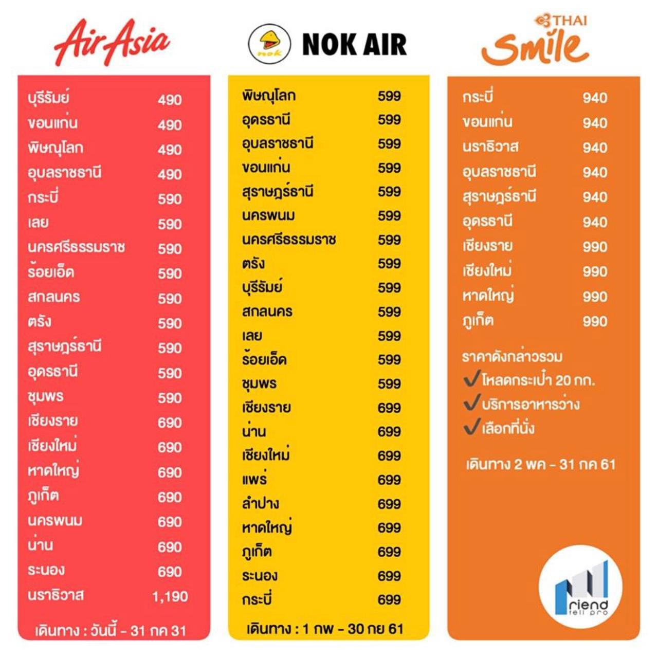 - เชียงใหม่, เชียงราย, หาดใหญ่, ภูเก็ต ราคาเริ่มต้น 685 บาทต่อเที่ยว