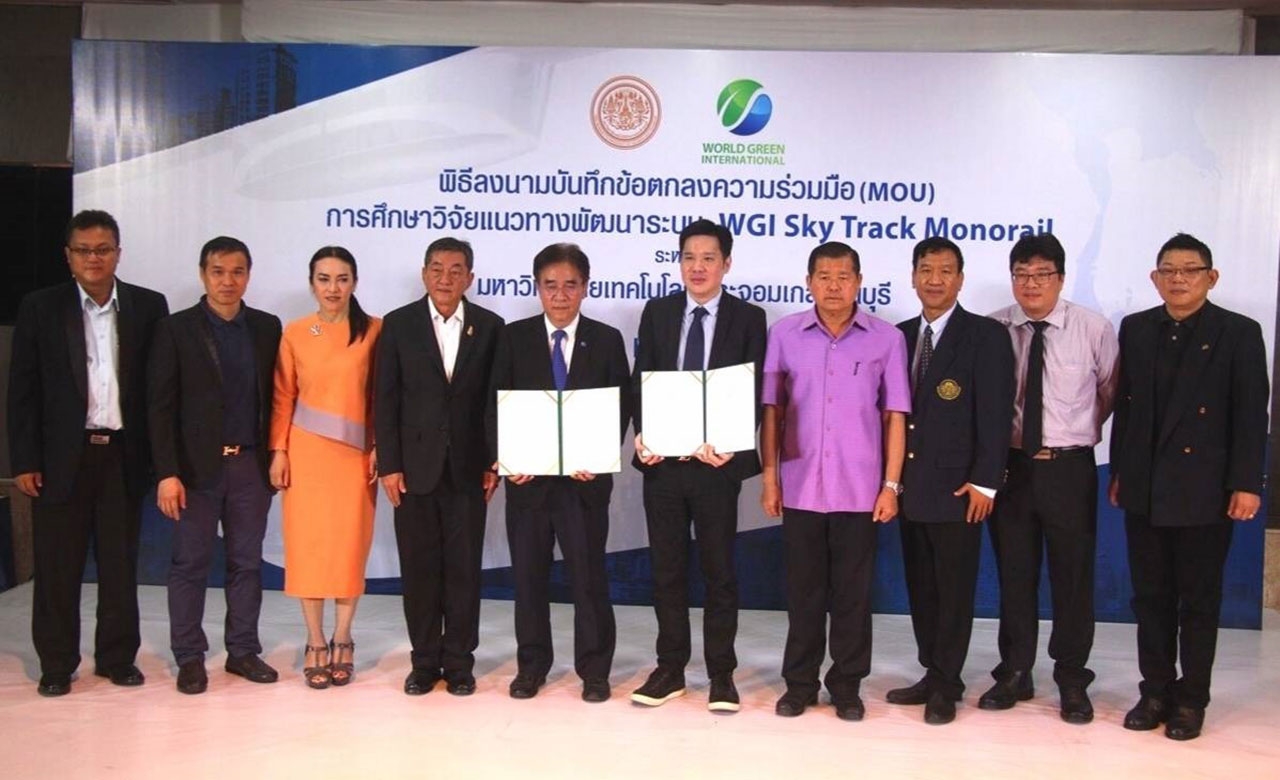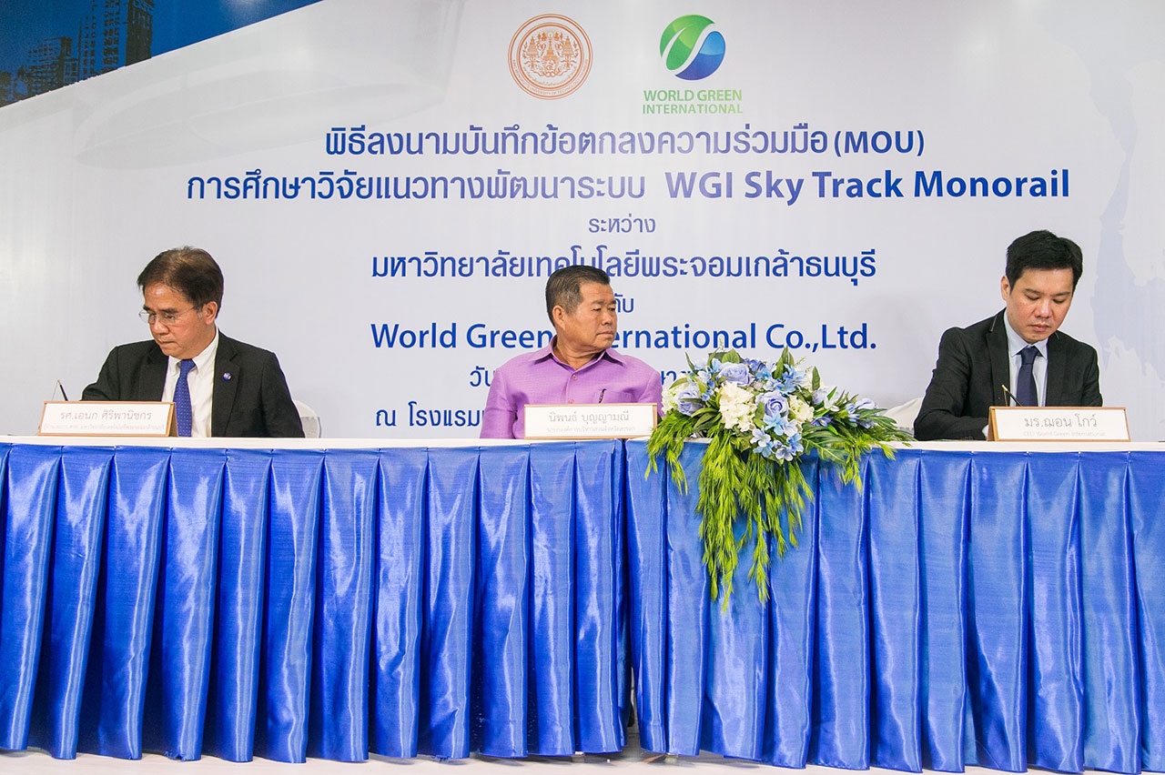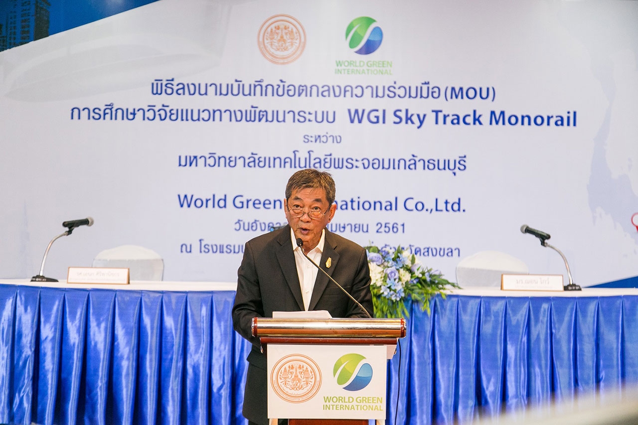 บริษัท เวิล์ด กรีน อินเตอร์เนชั่นแนล จำกัด (WGI) ผู้ดำเนินธุรกิจและที่ปรึกษาการลงทุนด้านเทคโนโลยีที่ทันสมัยและคำนึงถึงสิ่งแวดล้อม (Green Financing & Technology) จัดพิธีลงนามบันทึกข้อตกลงความร่วมมือทางวิชาการ ร่วมกับ มหาวิทยาลัยเทคโนโลยีพระจอมเกล้าธนบุรี (มจธ.) เพื่อศึกษาวิจัยแนวทางการพัฒนาระบบ WGI Sky Track Monorail ในอำเภอหาดใหญ่ มีเส้นทางตั้งแต่ สนามบินหาดใหญ่ถึงสถานีรถตู้ โดยภายในงานได้รับเกียรติจาก นายดลเดช พัฒนรัฐ ผู้ว่าราชการจังหวัดสงขลา ประธานในพิธี และนายกองค์การบริหารส่วนจังหวัดสงขลา นายนิพนธ์ บุญญามณี ให้เกียรติเป็นสักขีพยาน ในการลงนามระหว่าง รศ. เอนก ศิริพานิชกร ผู้อำนวยการ สวท. มหาวิทยาลัยเทคโนโลยีพระจอมเกล้าธนบุรี ประธานสาขาวิศวกรรมโยธา วิศวกรรมสถานแห่งประเทศไทยฯ และ มร. ฌอน โกว์ (Mr. Sean Goh) กรรมการบริหาร บริษัท เวิลด์ กรีน อินเตอร์เนชั่นแนล จำกัด เพื่อดำเนินการศึกษาถึงความเป็นไปได้ในการพัฒนาระบบ “WGI Sky Track Monorail รถไฟลอยฟ้า” นวัตกรรมใหม่ที่ทันสมัยและใส่ใจสิ่งแวดล้อม โดยการขับเคลื่อนด้วยแบตเตอรี่ลิเทียม ในการนำมาพัฒนาระบบคมนาคมภายในจังหวัดให้มีความสะดวกและทันสมัย ขานรับนโยบายไทยแลนด์ 4.0 ของภาครัฐ และนโยบายการพัฒนา 90 เมือง ใน 10 ประเทศของ ASEAN Smart City