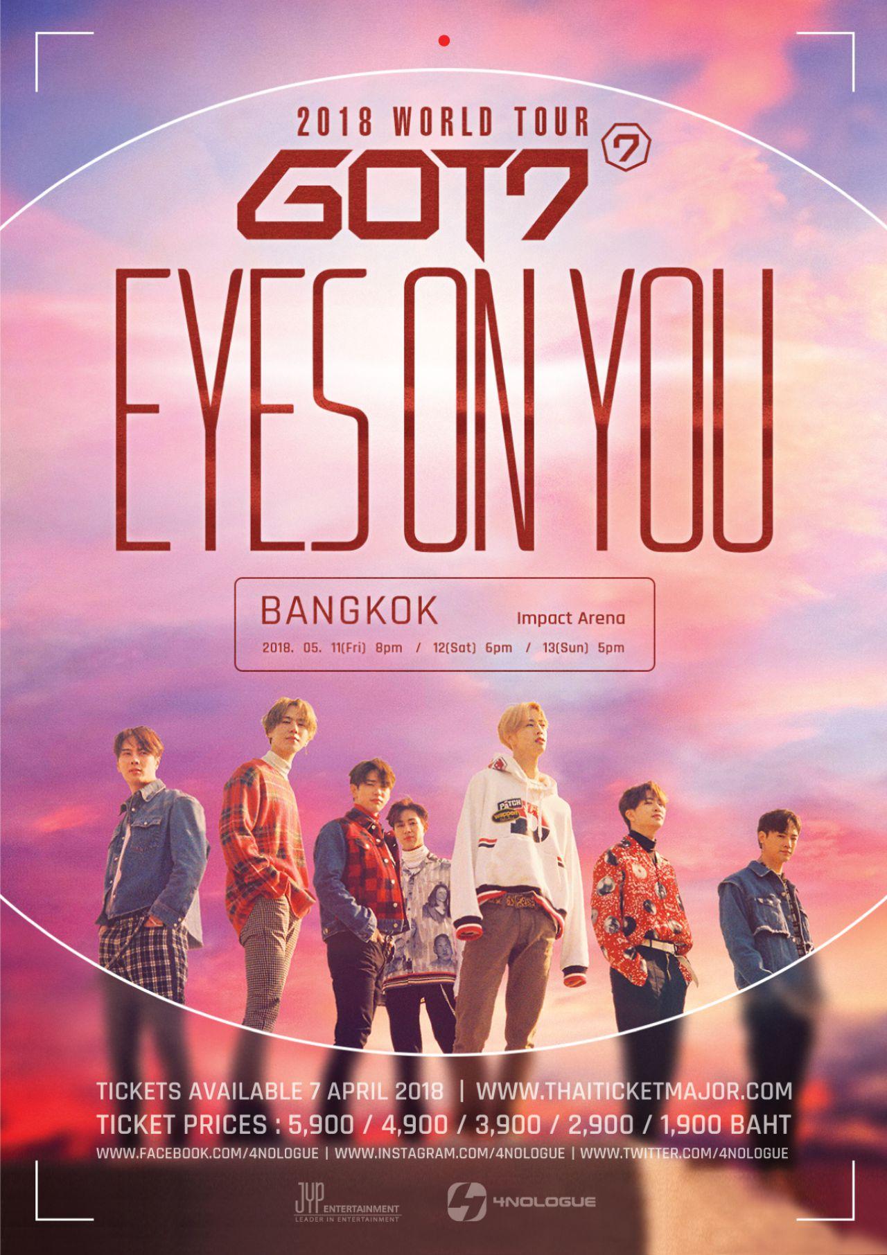 ด้วยความพิเศษที่ 4NOLOGUE จัดให้ 3 รอบเต็มอิ่ม กับรูปแบบเวทีที่มีแคทวอล์คใกล้ชิดแฟนๆ ที่สุด และไม่ซ้ำประเทศใดในโลก พร้อม Merchandise น่าสะสม อากาเซตัวจริงห้ามพลาด GOT7 2018 WORLD TOUR 'EYES ON YOU' IN BANGKOK เริ่มจำหน่ายบัตรในวันเสาร์ที่ 7 เมษายน 2561 บัตรราคา 5,900 / 4,900 (ยืน,นั่ง) / 3,900 / 2,900 / 1,900 บาท และเพื่อป้องกันมิจฉาชีพกดบัตรไปอัพราคา โฟร์โนล็อคและไทยทิกเก็ตเมเจอร์ จึงกำหนดให้ผู้ซื้อบัตรในช่วงเวลา 10.00 - 12.00 น. จ่ายเงินทันที และสงวนสิทธิ์การกดบัตรสูงสุดได้ท่านละ 4 ใบเท่านั้น