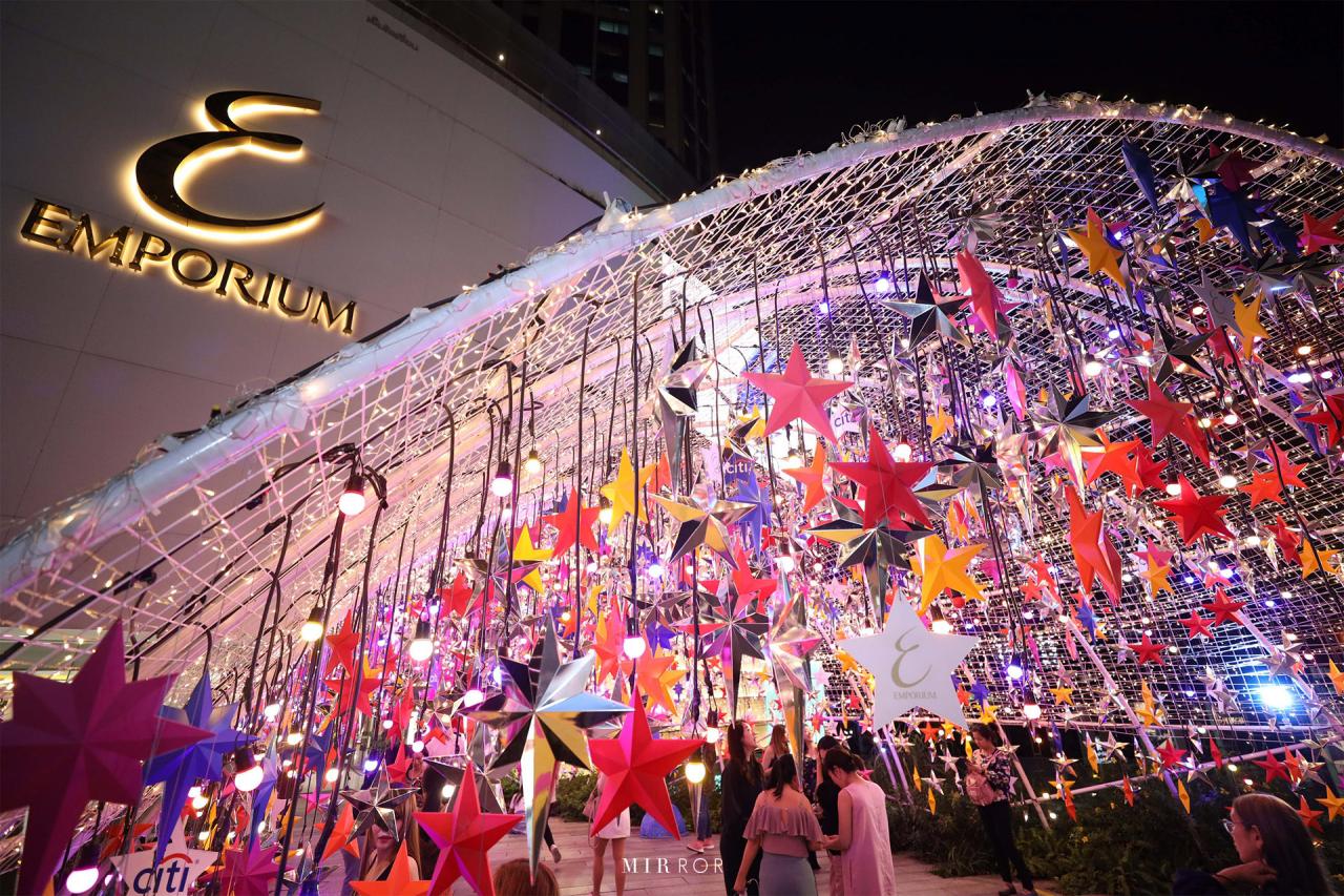 สำหรับ MBK ก็มีบริเวณจัดไฟให้เราได้ไปถ่ายรูปเช่นเดียวกัน ซึ่งต้นคริสต์มาสของที่นี่แปลกใหม่ไม่เหมือนใคร เพราะมันทำจากปลาตะเพียนสาน เรียกได้ว่าเป็นการผสมผสานระหว่างเทศกาลคริสต์มาสและความเป็นไทยได้อย่างลงตัว นอกจากนี้ต้นคริสต์มาสของที่นี่ยังมีความสูงมากถึง 19 เมตรเลยทีเดียว และไฮไลต์เด็ดอีกอย่างคือ ในตอนกลางคืนปลาตะเพียนจะมีการเปลี่ยนสีสัน แถมยังมีแสงไฟสะท้อนไปยังเกล็ดปลาให้มีความแวววาว เหมือนปลากำลังว่ายน้ำพลิ้วไหวไปมาเลยนะคะ Lady Mirror ทุกคน