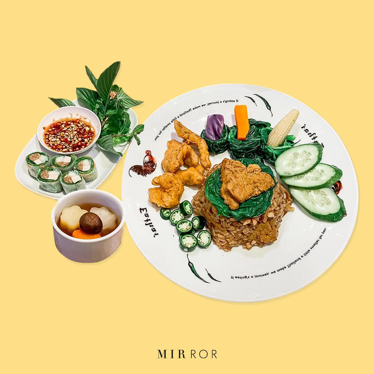 ชุดข้าวผัดเนื้อทุบเจ มาในสีสันสดใสน่ากินอย่างมาก แถมการจัดจานก็ดูน่ารับประทาน ฉีกกฎหน้าตาอาหารเจธรรมดาอย่างที่เราเคยเห็นกัน