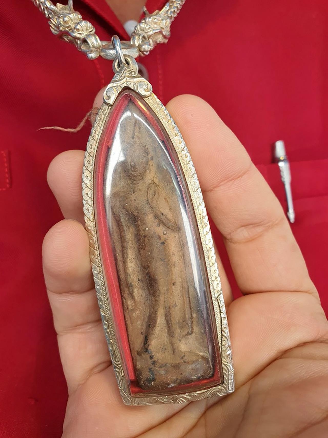 ภูวนาถ มุสิกภูตานนท์ อายุ 59 ปี เจ้าของกิจการวิสาหกิจชุมชน “กะหรี่ 2 ปั๊บ”...“โอทอป 5 ดาว” ขนมอร่อยและขนมเด่นเมืองสุโขทัย ข้างตลาดโต้รุ่ง ซอยตรงข้ามรัศมีอพาร์ทเม้นท์ บอกว่า ห้อยพระลีลาถ้ำหีบสุโขทัยมานานหลายปีแล้ว คุณพ่อให้มาแขวน อาจจะเรียกได้ว่าเป็นสมบัติประจำตระกูลที่ส่งต่อสืบทอดกันมาจากรุ่นสู่รุ่นเชื่อ...ศรัทธาเป็นอย่างยิ่งว่า ห้อยคอแล้วจะนำมาซึ่งความเจริญก้าวหน้า ค้าขายดี
