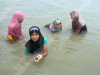 ขากลับออกมาจากป่าโกงกาง เด็กๆยังได้โดดลงเล่นน้ำทะเลและจับหอยกันอีกรอบบริเวณดอนหอย กลางอ่าวปัตตานี ทั้งสนุกและปลอดภัยไร้กังวล ก็เพราะระดับน้ำสูงที่นั่นไม่เกินหัวเข่าแค่นั้นเอง