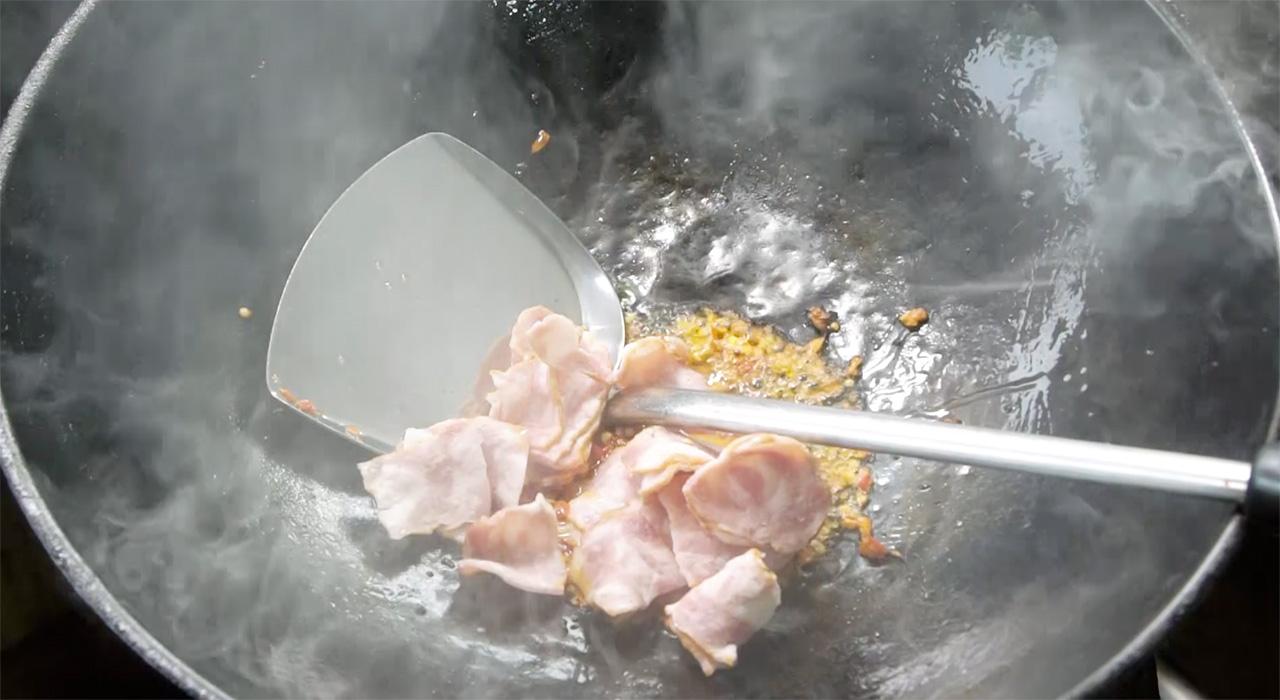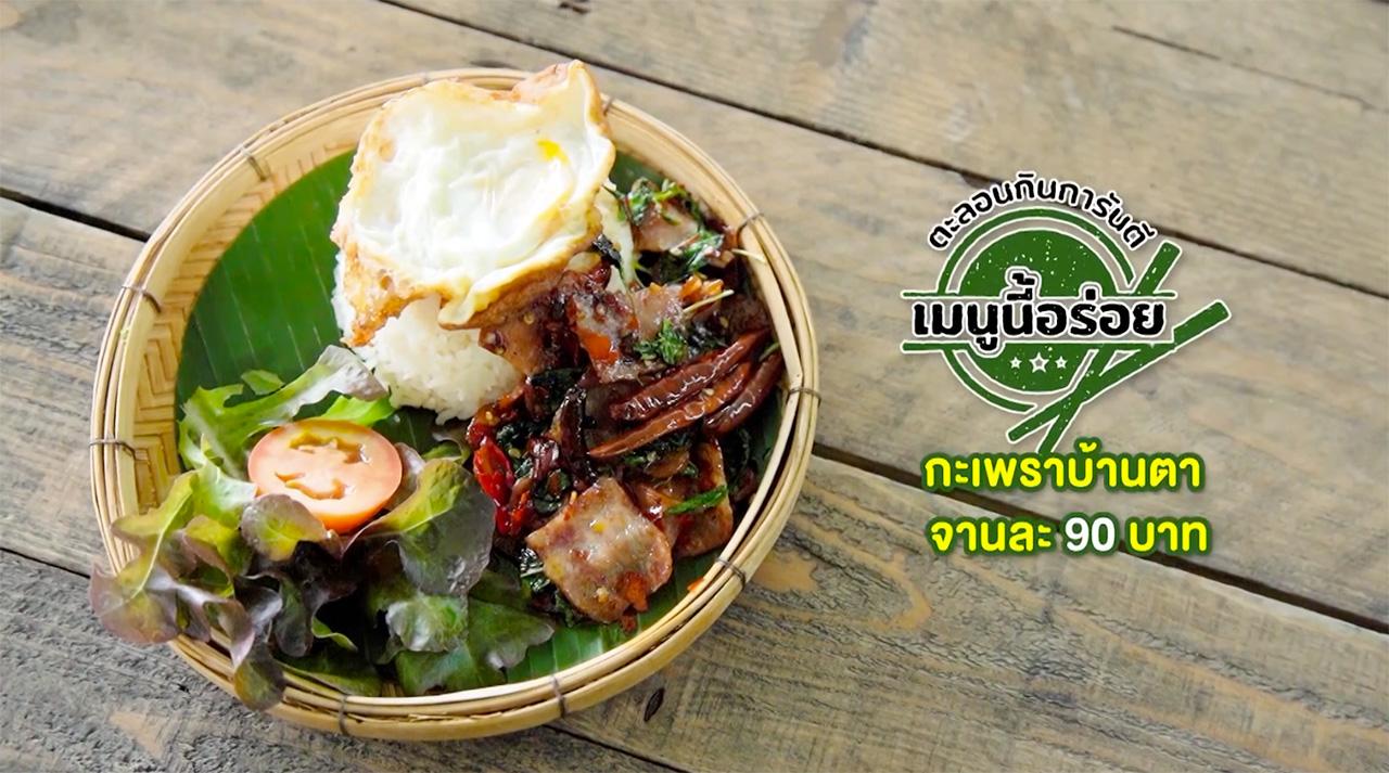 กะเพราบ้านตา ราคา 90 บาท กะเพราเบคอนผัดพริกแห้ง เผ็ดร้อนจากพริก 2 แบบและรสเค็มนัวๆ จากเบคอน
