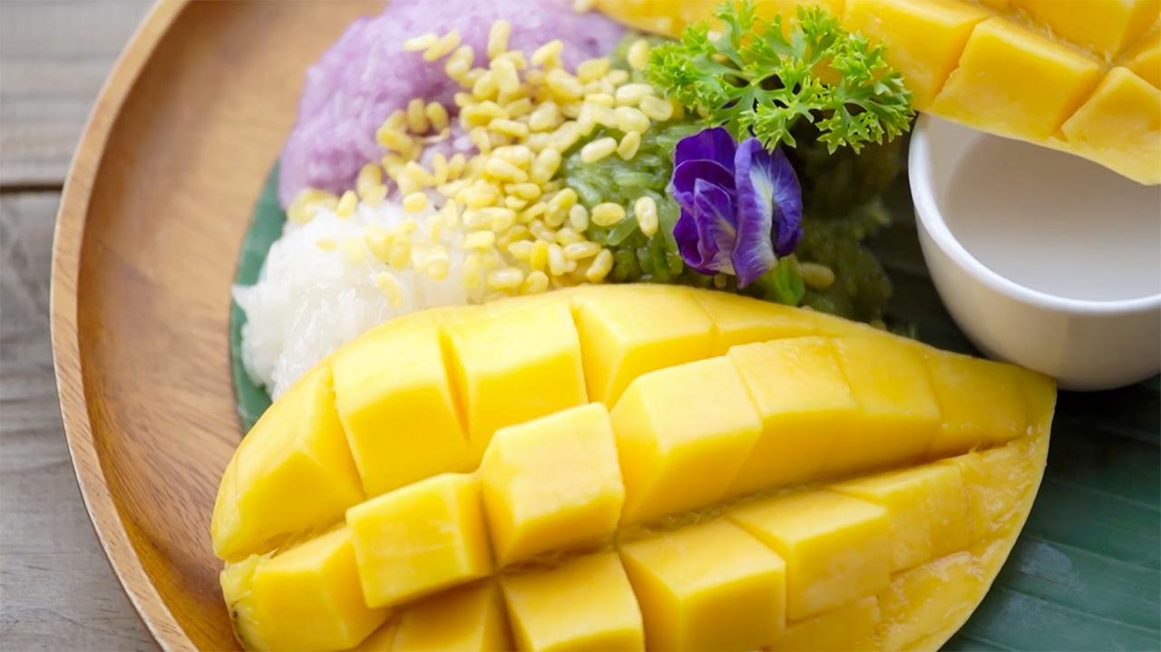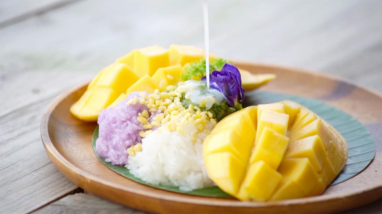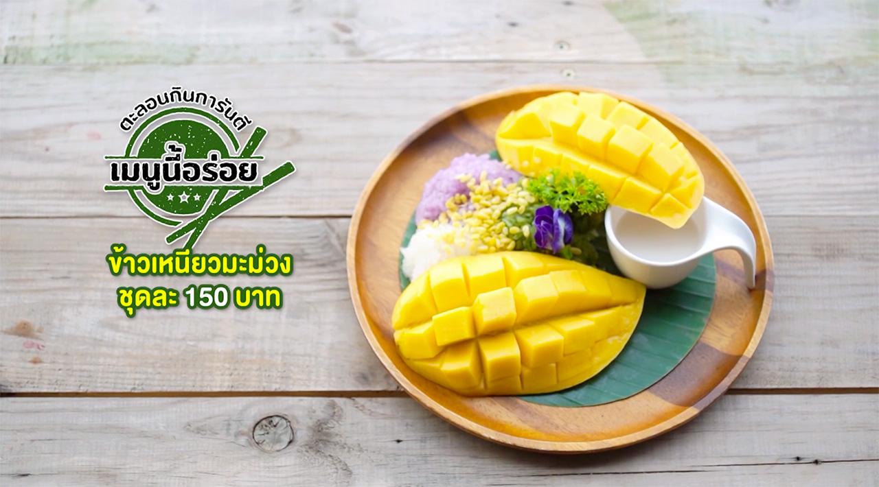 ข้าวเหนียวมะม่วง 3 สี ราคา 150 บาท (ข้าวเหนียวขาว, สีม่วงจากอัญชัน และสีเขียวจากใบเตย) เมนูนี้เราทำขายเฉพาะวันเสาร์-อาทิตย์เท่านั้น ในจำนวนจำกัดหมดแล้วหมดเลย