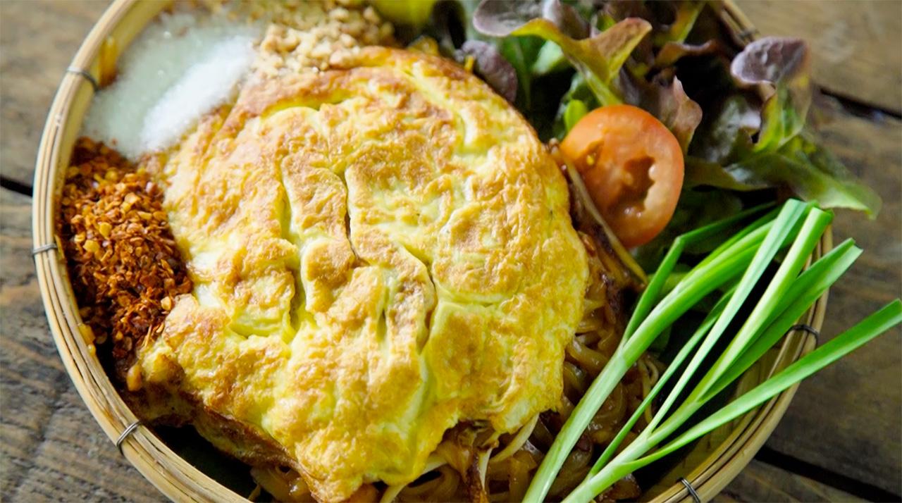 ผัดไทยกุ้งสด ราคา 70 บาท เสิร์ฟกับกระด้ง น้ำปรุงจะเป็นสูตรของทางร้าน หวานนำ มีไข่โปะมาเต็มๆ จาน