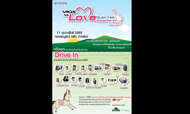 กลิ่นอายแห่งความรัก ลอยตลบอบอวลอุ่นๆ กับกิจกรรมที่ โตโยต้า มอเตอร์ ประเทศไทย จำกัด ร่วมกับ ทองสมบูรณ์ คลับ โดยนายพลพจน์ พลเจริญเกียรติ และบริษัท อีส สกาย จำกัด โดยนายธีราวิชญ์ ธรรมค้า กรรมการผู้จัดการ สองพันธมิตรผู้ร่วมจัดงาน ภูมิใจเสนอ เทศกาลดนตรีแห่งความรัก “Vios We Love Music Fest. @ Thongsomboon Club”...