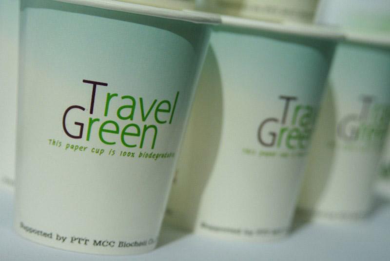 นอกเหนือจากเชื้อเพลิงชีวภาพแล้ว บรรจุภัณฑ์ที่ใช้บริการบนเครื่องบินนั้นก็เป็นส่วนหนึ่งในการสร้างมลพิษให้กับสิ่งแวดล้อม ถ้วยกระดาษเคลือบด้วย PBS (Polybutylene Succinate) พลาสติกย่อยสลายได้ จึงเป็นทางเลือกหนึ่งซึ่งทางกลุ่มบริษัท ปตท.พัฒนาขึ้นเพื่อใช้เป็นต้นแบบ และนำมาใช้ในภาคธุรกิจเป็นครั้งแรกในโอกาสการปฏิบัติการบินพิเศษด้วยเชื้อเพลิงอากาศยานชีวภาพ ของการบินไทย โดยใช้ทดแทนบรรจุภัณฑ์กระดาษบรรจุอาหารที่เคลือบด้วยพลาสติก LDPE ที่ใช้กันอยู่ในปัจจุบัน ซึ่งไม่สามารถย่อยสลายได้ ซึ่งก่อให้เกิดมลพิษต่อสิ่งแวดล้อม ส่วนพลาสติกย่อยสลายได้ เมื่อถูกทิ้งเป็นขยะ และนำไปฝังกลบจะถูกย่อยสลายด้วยจุลินทรีย์ในดิน โดยปล่อยก๊าซคาร์บอนไดออกไซด์และน้ำออกมา ซึ่งพืชสามารถนำไปใช้ในการสังเคราะห์แสงเพื่อเจริญเติบโตได้ ดังนั้น พลาสติกชีวภาพ PBS ของกลุ่ม ปตท. จะสามารถช่วยลดปัญหาขยะ และก๊าซเรือนกระจกได้อย่างยั่งยืน