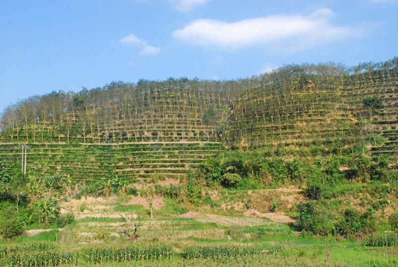 ที่ราบ น้อยใหญ่และบนภูเขาสูงส่วนใหญ่ปลูกยางพาราเป็นแนวทึบทะมึน ไกด์สาวชาวสิบสองปันนาเฉลยให้ฟังว่า ยางพาราที่ปลูกในจีนและลาว ยังไม่พอใช้สำหรับ 1 มณฑลในจีน