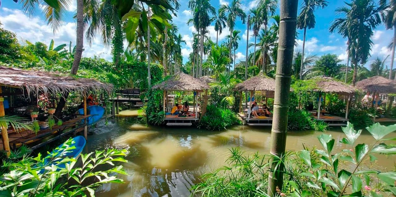 คาเฟ่ในสวนมะพร้าว ใกล้ตลาดดอนหวาย และวัดไร่ขิง บรรยากาศผ่อนคลาย มีเรือให้พายในท้องร่องสวน เป็นคาเฟ่ดังย่านนครปฐม