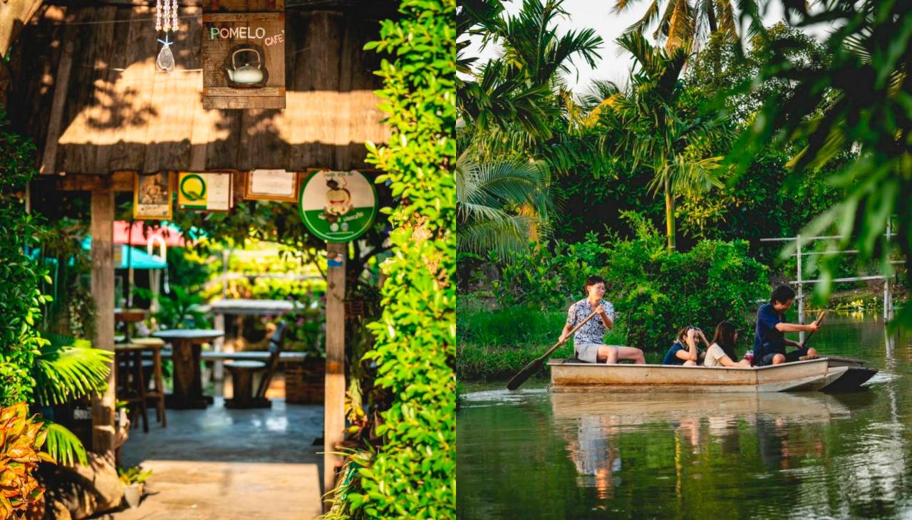 คาเฟ่ในสวน บริการอาหาร ขนม พร้อมเสิร์ฟท่ามกลางธรรมชาติและสวนผลไม้ นครปฐม เครื่องดื่มถูกใจวัยรุ่น ใส่วิปครีมเน้นๆ บริการเรือพายสำหรับนักท่องเที่ยวที่อยากชมสวนอย่างใกล้ชิด