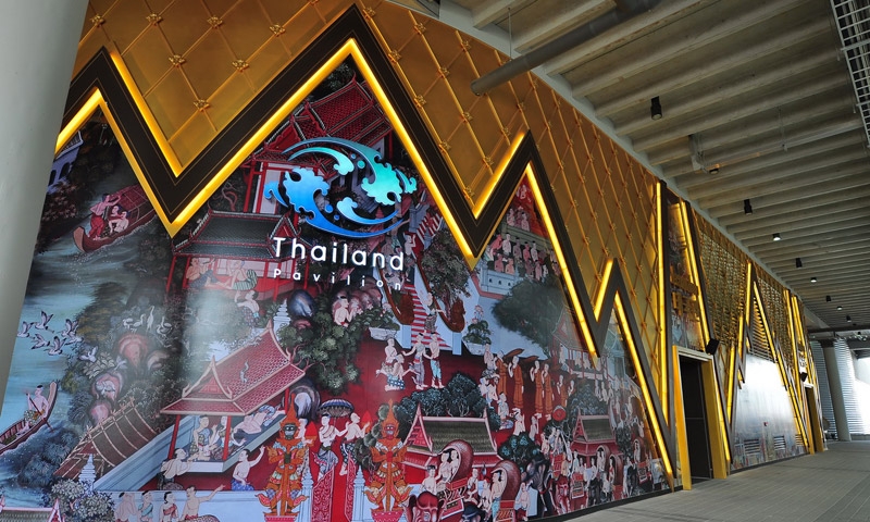 เอกลักษณ์ประจำชาติ ถ่ายทอดผ่านสถาปัตยกรรมและจิตรกรรมที่สะท้อนถึงความเป็นไทย ให้นานาประเทศได้รู้จักมากยิ่งขึ้น ทั้งลวดลายไทยกระจังหยวกประยุกต์เป็นแผ่นทองฉลุ เพื่อเป็นองค์ประกอบรอบศาลาไทย ที่แสดงให้เห็นถึงฉากความงดงามของวิถีชีวิตไทยริมชายฝั่งและท้องทะเล ผ่านห้องจัดแสดงนิทรรศการและจัดการแสดงทางวัฒนธรรม บนพื้นที่ 599 ตารางเมตร”