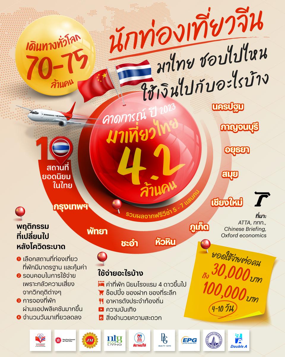 - ปี 2023 คาดการณ์ว่า นักท่องเที่ยวจีนจะเดินทางออกไปท่องเที่ยวทั่วโลกรวมกว่า 70 ล้านคน มีเม็ดเงินใช้จ่ายสะพัด 168,000 ล้านดอลลาร์สหรัฐ หรือประมาณ 6 ล้านล้านบาท ใกล้เคียงกับช่วงก่อนโควิด-19 ระบาด