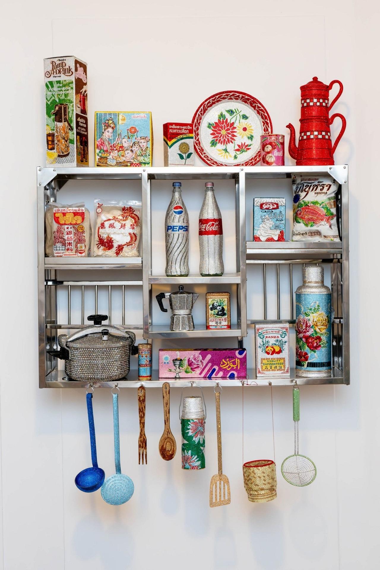 ไปจนถึงของวินเทจของไทยต่างๆ อย่างคอลเลกชั่น MA CUISINE DE RÊVE (MY DREAM KITCHEN) ชั้นวางของเมทัลลิคสไตล์อินเดีย ประกอบด้วยของใช้วินเทจถึง 27 ชิ้นและผลิตภัณฑ์อาหารที่ประดับด้วยคริสตัลสวารอฟสกี้ อาทิ กระป๋องแป้งเย็นตรางู ขวดเบียร์ท้องถิ่น และกล่องยากันยุงห่านฟ้า ถ้วยบะหมี่กึ่งสำเร็จรูปแบรนด์ไทย และอีกมากมาย
