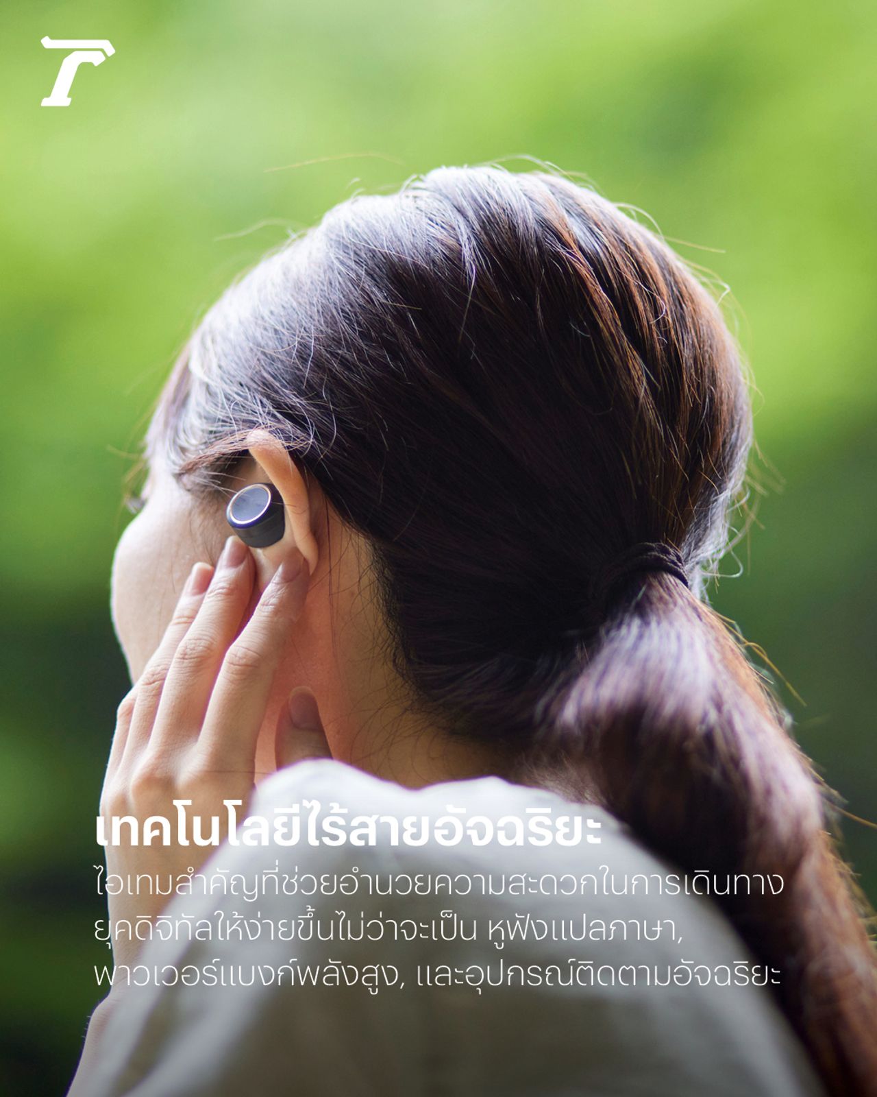 เทคโนโลยีไร้สายอัจฉริยะ เป็นหนึ่งในไอเทมสำคัญที่นิยมอีกอย่างหนึ่งโดยเฉพาะหูฟังรุ่นใหม่ๆ ที่ปัจจุบันไม่ได้มีแค่ฟังก์ชันตัดเสียงรบกวนอย่างเดียวเท่านั้น แต่ยังมาพร้อมฟังก์ชันการแปลภาษาแบบเรียลไทม์ที่ไว้ใช้เดินทางไปต่างประเทศแบบไม่ต้องกังวล หรือระบบสั่งงานด้วยเสียงที่ชาญฉลาด และแบตเตอรี่ที่ใช้งานได้ยาวนาน เหมาะสำหรับการเดินทางไกลและการดื่มด่ำบรรยากาศได้โดยไม่ถูกรบกวน