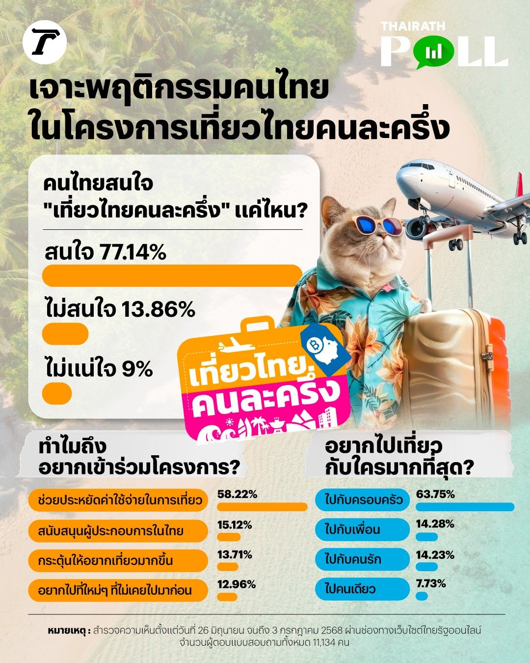 ผลสำรวจของไทยรัฐโพลเกี่ยวกับโครงการเที่ยวไทยคนละครึ่ง ซึ่งจัดทำขึ้นเพื่อสำรวจความสนใจ รวมถึงพฤติกรรมการท่องเที่ยวของคนไทย พบว่าผู้ตอบโพลให้ความสนใจโครงการนี้ 77.14 เปอร์เซ็นต์