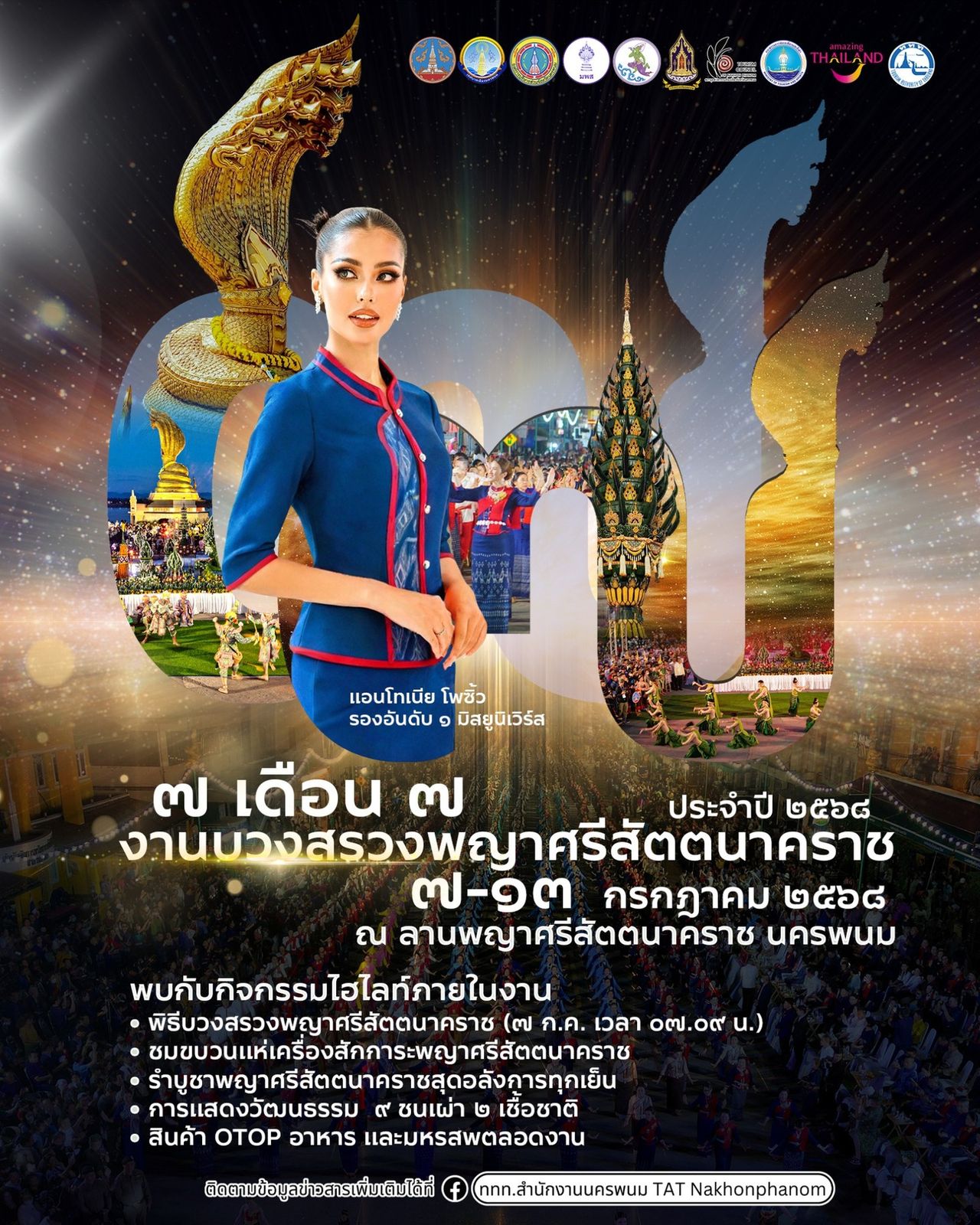งานบวงสรวงพญาศรีสัตตนาคราช 2568 เริ่มขึ้นแล้วที่จังหวัดนครพนม เชิญชวนนักท่องเที่ยวมาสัมผัสบรรยากาศแห่งความศรัทธา และวัฒนธรรมสุดยิ่งใหญ่ โดยมี "แอนโทเนีย โพซิ้ว" มิสยูนิเวิร์สไทยแลนด์ 2023 มาร่วมรำบูชาเพื่ออนุรักษ์ประเพณีท้องถิ่น และสืบสานตำนานความเชื่อของชาวบ้านริมฝั่งโขง