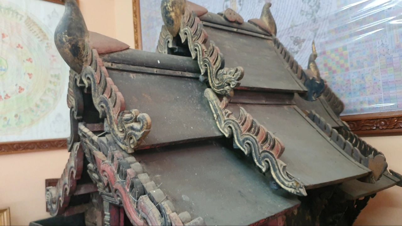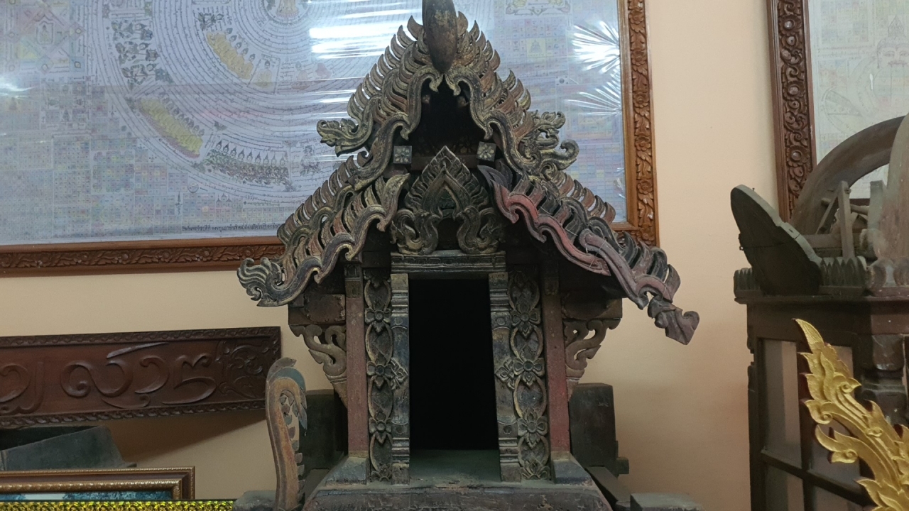ชิ้นงานทำจากไม้สักทั้งหลัง ประดับกระจกสี และดีบุก รายละเอียดสถาปัตยกรรมครบถ้วน หลังคาซ้อน หน้าจั่ว ช่อฟ้า ใบระกา บานประตู หน้าต่าง สัดส่วนกลมกลืนกับอาคารจริง เหมือนย่อโลกของวิหารล้านนาไว้ในกล่องเดียว ขนาดตัวแบบราว สูง 2 ฟุต กว้าง 1 ฟุต ยาว 2 ฟุต กะทัดรัดแต่เล่าเรื่องฝีมือช่างได้เต็มๆ