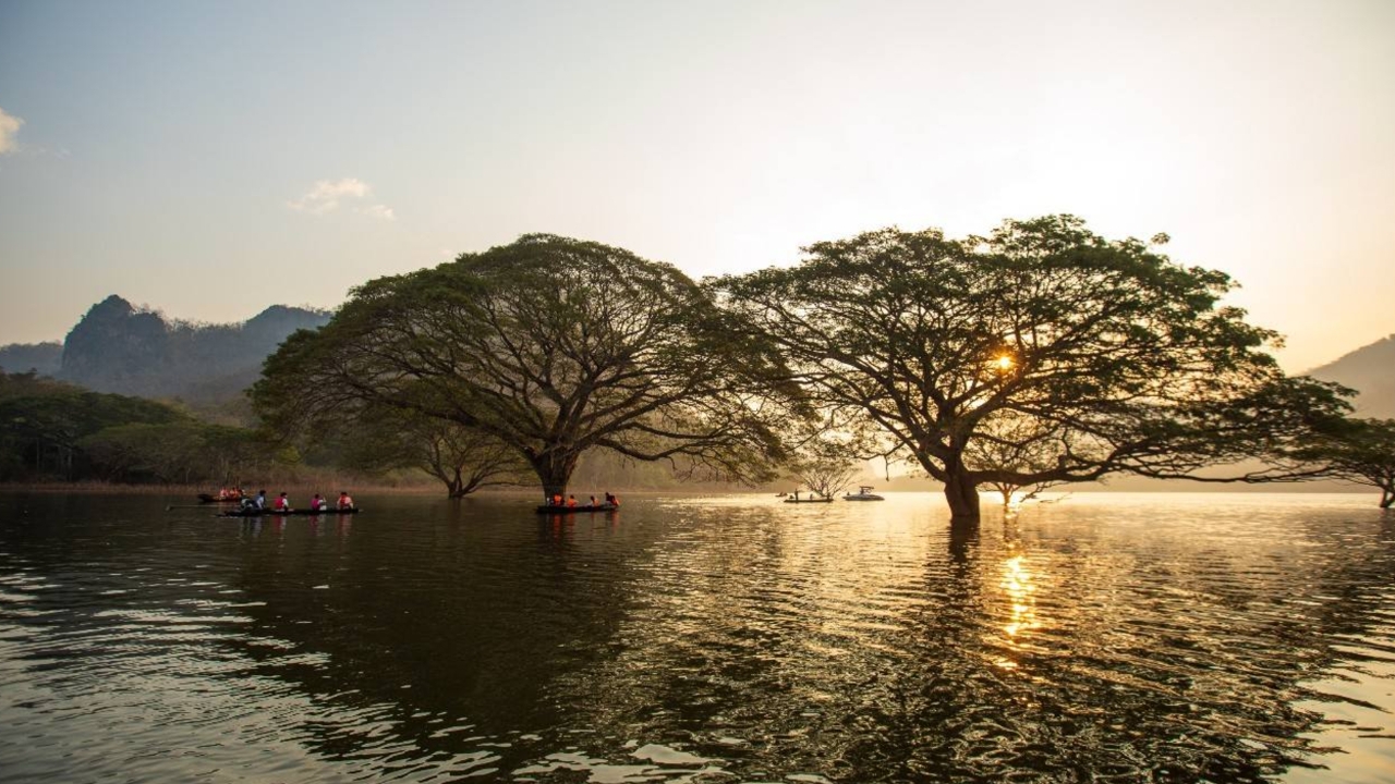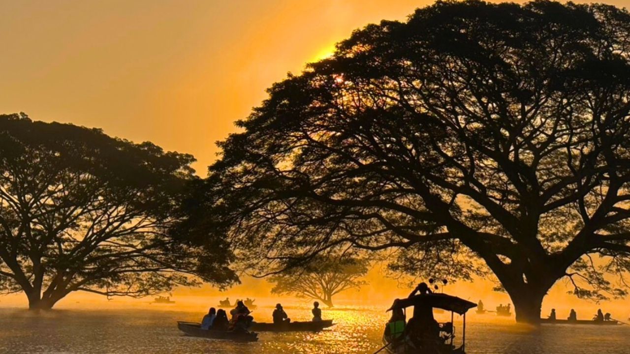 จุดเช็กอินที่เรียกได้ว่าเป็น Unseen Thailand ของยุคนี้เลยก็ว่าได้ เมื่อความยิ่งใหญ่ของต้นฉำฉาอายุนับสิบปีไม่ได้อยู่บนดินอย่างที่เราคุ้นตา แต่กลับยืนต้นตระหง่านอยู่กลางผืนน้ำกว้างใหญ่ ยามเช้าที่ไอหมอกจางๆ ลอยเหนือน้ำและแสงอาทิตย์สีทองลอดผ่านกิ่งก้านสาขา