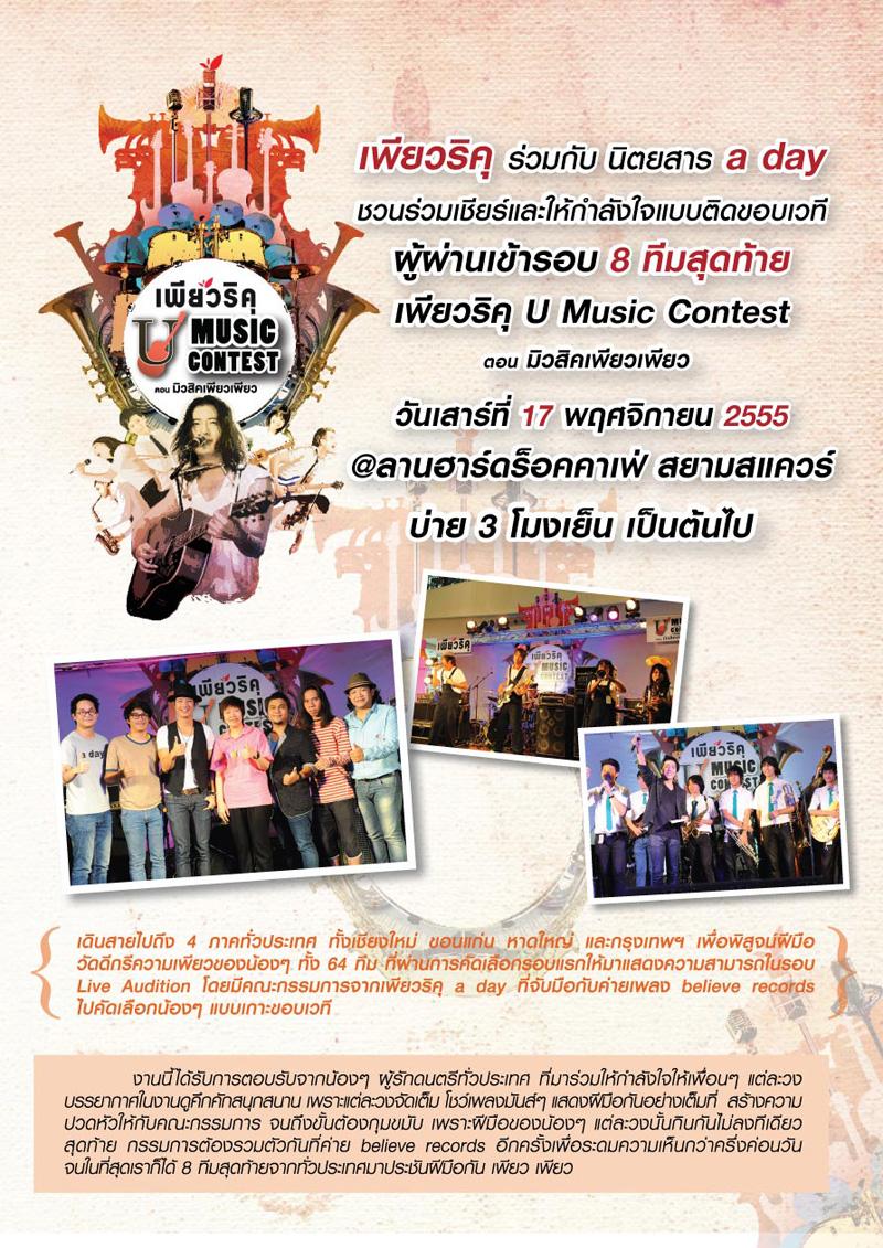 “เพียวริคุ” ร่วมกับ นิตยสาร “อะเดย์” เตรียมจัดงานประกาศรางวัลรอบชิงชนะเลิศ โครงการ “เพียวริคุ ยู มิวสิก คอนเทสต์” ตอน มิวสิกเพียวเพียว หลังประสบความสำเร็จจากการจัดประกวดวงดนตรีระดับมหาวิทยาลัยทั่วทุกภาคของประเทศ ซึ่งในรอบแรกมีนิสิตนักศึกษาตอบรับสมัครเข้าร่วมกิจกรรมอย่างคับคั่งถึง 255 วง จาก 76 มหาวิทยาลัยทั่วประเทศ!