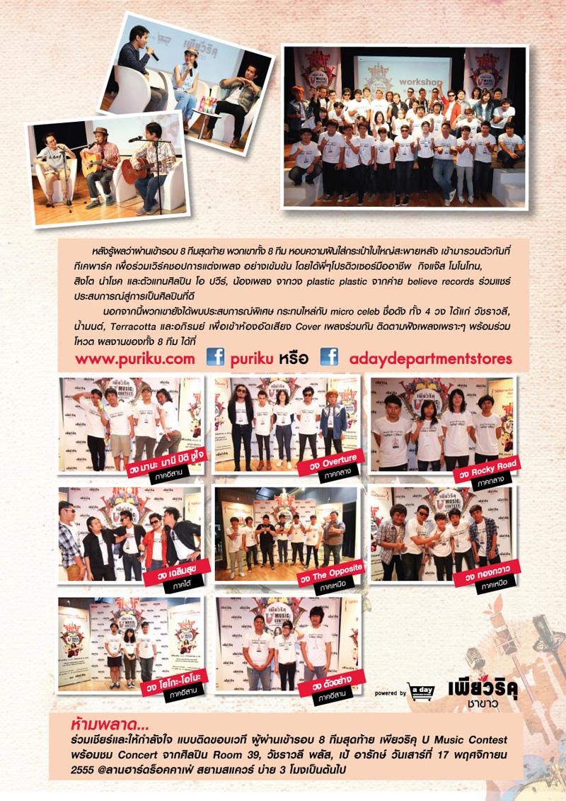 โดยคัดเหลือ 64 ทีมในรอบสอง เพื่อทำการไลฟ์ออดิชั่นให้คณะกรรมการจากเพียวริคุ นิตยสารอะเดย์ ค่ายบีลีฟเรคคอร์ด และศิลปิน เป้ อารักษ์, วัชราวลี พลัส, อภิรมย์, เทอร์ราค็อตต้า, น้ำมนต์ เดินสายวัดดีกรี 4 ภาคทั่วประเทศ ทั้งที่เชียงใหม่ ขอนแก่น หาดใหญ่ และกรุงเทพฯ จนเหลือหัวกะทิ 8 ทีมสุดท้ายที่ได้ผ่านกระบวนการเวิร์กช็อปเข้มข้น เรียนรู้ทฤษฎีการร้องการแต่งเพลงจากกูรูรุ่นพี่ ค่าย ‘บีลีฟเรคคอร์ด’ นอกจากนี้ยังได้ถ่ายคลิปฟีเจอร์ริ่ง ดวลเพลงกับศิลปิน วัชราวลี พลัส, อภิรมย์, เทอร์ราค็อตต้า, น้ำมนต์ ลงเว็บไซต์ยูทูบ และเฟซบุ๊กเพียวริคุ เพื่อให้คอดนตรีได้มีโอกาสรวมพลังกดไลค์ร่วมเชียร์ทีมที่ตัวเองชื่นชอบ เรียกว่าผลักดันปั้นให้คว้ารางวัล ‘TOP VIEW’ ใน Youtube และ ‘POPULAR VOTE’ ใน http://www.facebook.com/purikuthailand
