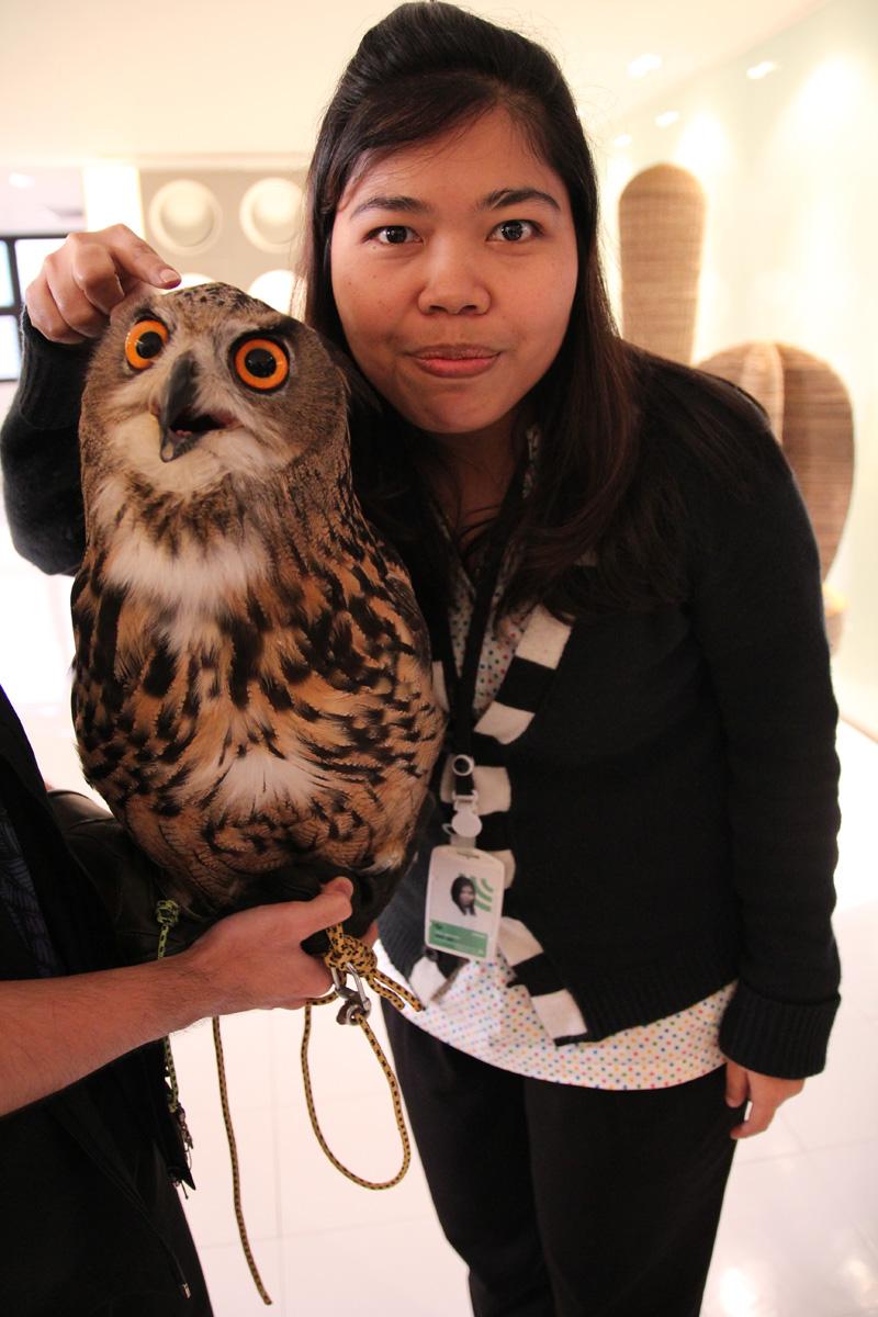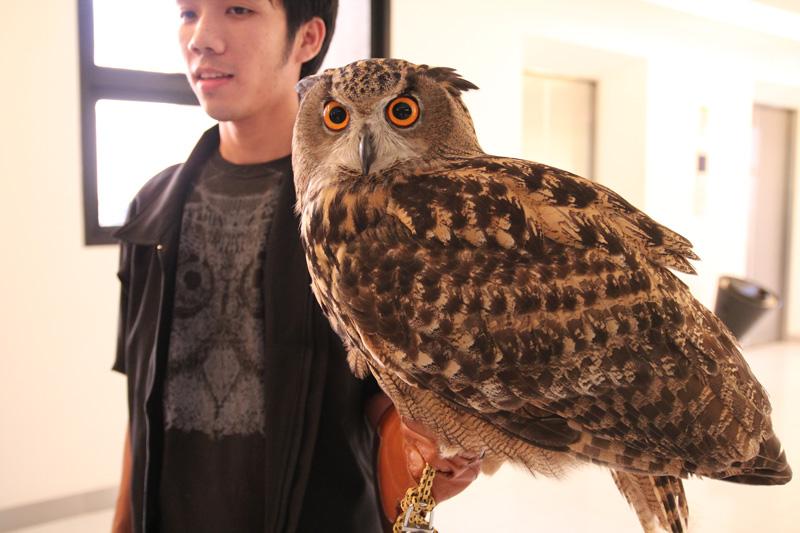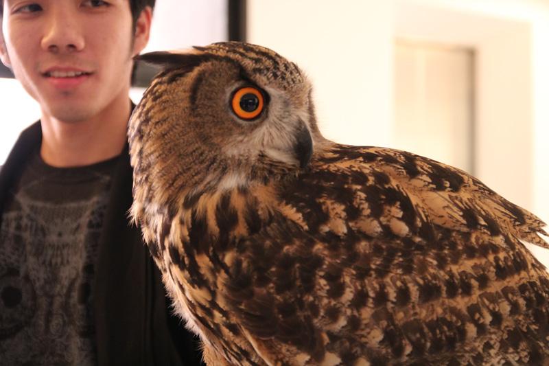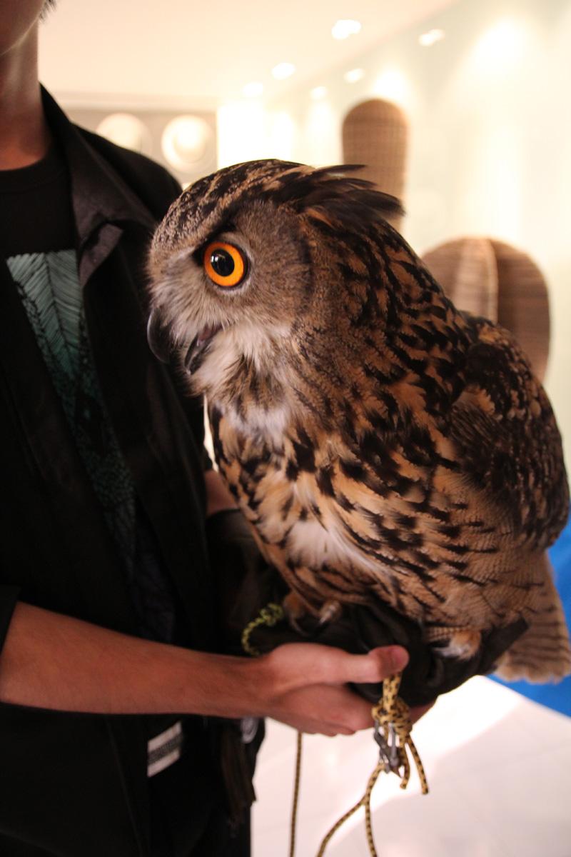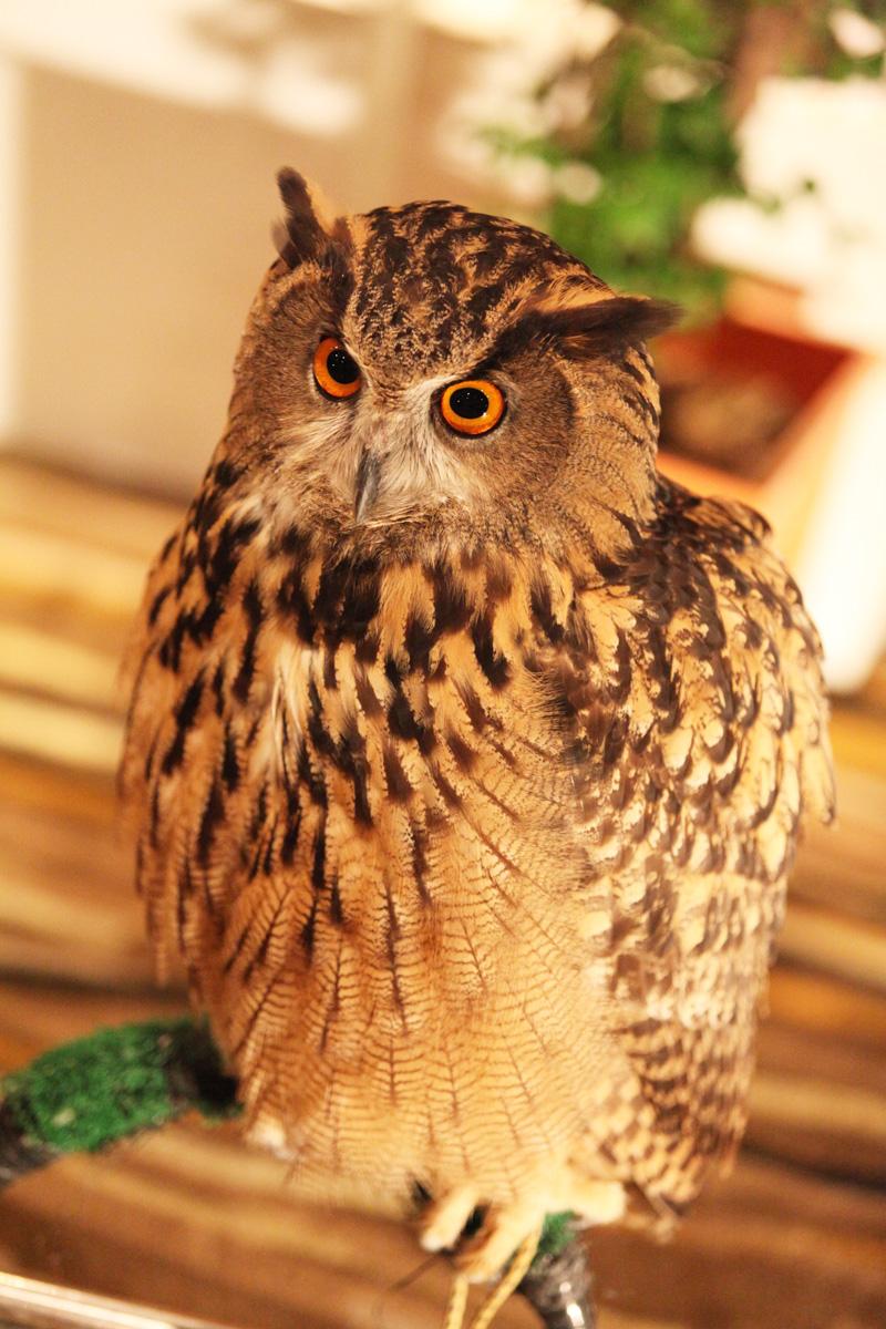 นกฮูก Eurasian Eagle Owl (ยูเรเซีย) เจ้าตัวนี้ชื่อว่า “น้องปุกปุย” เป็นนกฮูกสายพันธุ์ที่ใหญ่ที่สุดในโลก ตากลมโตแป๋วแหววเหมือนตุ๊กตา หูของมันที่เราเห็นอยู่นั้น จริงๆ แล้วเป็นคือขนของมัน ปุกปุยมีอายุ 2 ปี น้ำหนัก 3 กิโลกรัม เจ้าของนำเข้ามาจากกลุ่มประเทศแถบยุโรป กินอาหารสดแช่แข็งซึ่งเป็นจำพวกนกกระทา หรือลูกไก่ 4-5 ตัว/วัน ชอบอยู่เฉยๆ นิ่งๆ สามารถเกาะขอนไม้อยู่นิ่งๆ ได้เป็นชั่วโมง นกนี้เป็นสัตว์ป่าคุ้มครอง ซึ่งจะมี พ.ร.บ.สัตว์ป่าคุ้มครองควบคุม อยู่ในจำพวกเดียวกันกับกลุ่มนกนักล่าประเภทเหยี่ยว แร้ง นกอินทรี นกฮูกตัวนี้ราคาเฉียดแสน เจ้าของรักมาก เลี้ยงมาตั้งแต่เป็นลูกนก จนตัวโตอุ้มไม่ไหว