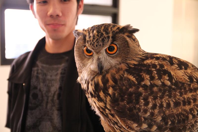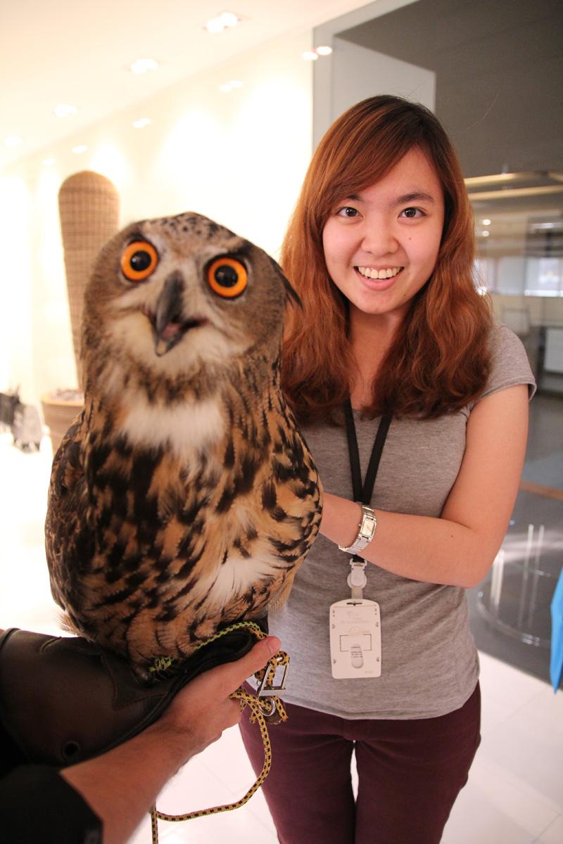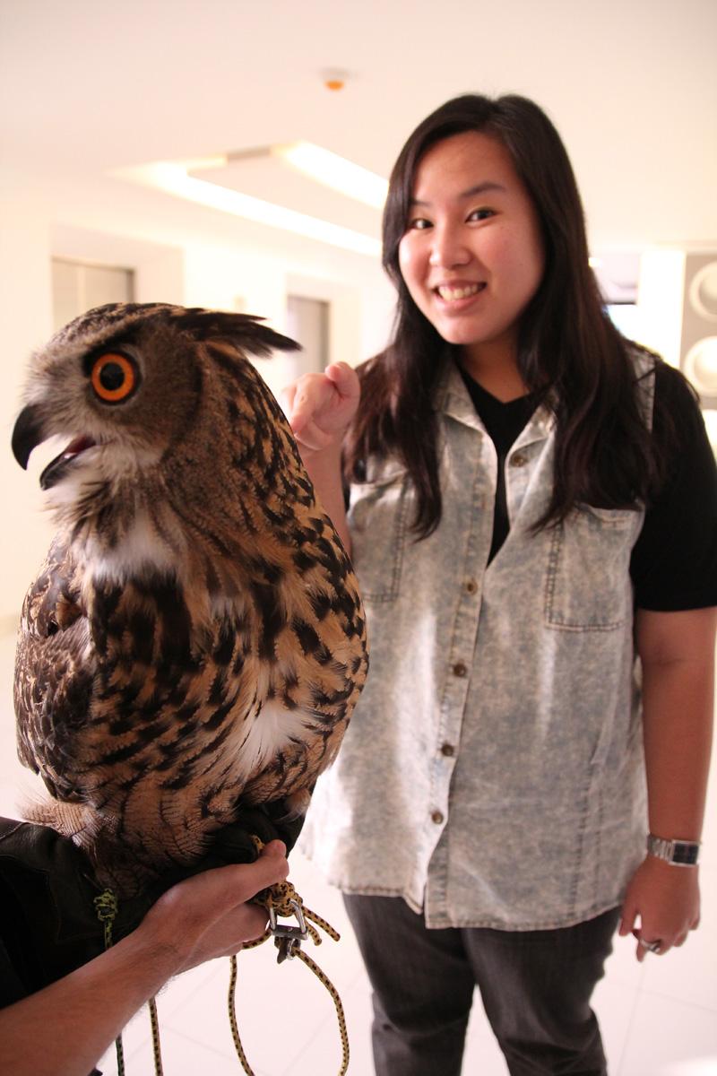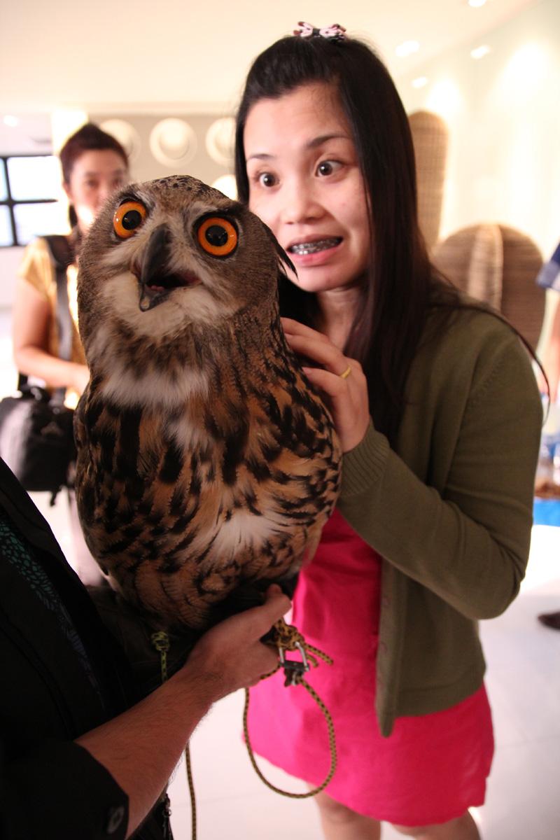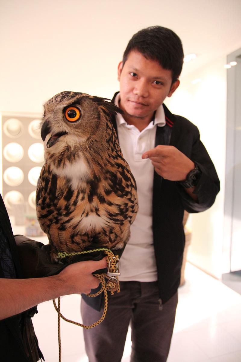 นกฮูก Eurasian Eagle Owl (ยูเรเซีย) เจ้าตัวนี้ชื่อว่า “น้องปุกปุย” เป็นนกฮูกสายพันธุ์ที่ใหญ่ที่สุดในโลก ตากลมโตแป๋วแหววเหมือนตุ๊กตา หูของมันที่เราเห็นอยู่นั้น จริงๆ แล้วเป็นคือขนของมัน ปุกปุยมีอายุ 2 ปี น้ำหนัก 3 กิโลกรัม เจ้าของนำเข้ามาจากกลุ่มประเทศแถบยุโรป กินอาหารสดแช่แข็งซึ่งเป็นจำพวกนกกระทา หรือลูกไก่ 4-5 ตัว/วัน ชอบอยู่เฉยๆ นิ่งๆ สามารถเกาะขอนไม้อยู่นิ่งๆ ได้เป็นชั่วโมง นกนี้เป็นสัตว์ป่าคุ้มครอง ซึ่งจะมี พ.ร.บ.สัตว์ป่าคุ้มครองควบคุม อยู่ในจำพวกเดียวกันกับกลุ่มนกนักล่าประเภทเหยี่ยว แร้ง นกอินทรี นกฮูกตัวนี้ราคาเฉียดแสน เจ้าของรักมาก เลี้ยงมาตั้งแต่เป็นลูกนก จนตัวโตอุ้มไม่ไหว