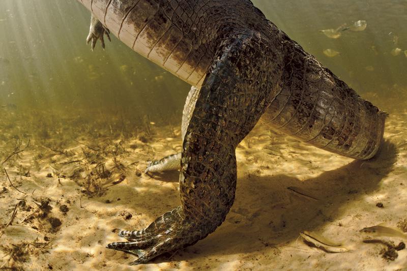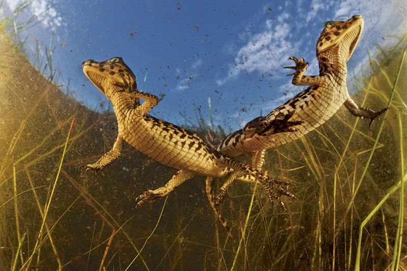 จุดเล็กๆ เหล่านี้คือดวงตาที่คอยระแวดระวังภัยของลูกเคแมนยากาเร สัตว์ในวงศ์จระเข้ ตอนกลางวัน พวกมันจะซ่อนตัวอยู่กลางดงหญ้าน้ำเพื่อหลบภัยจากนกยางหรือนกกระสาที่อาจโฉบลงมากินพวกมันเป็นอาหารว่าง พอตกกลางคืน พวกมันจะออกหาแมลงและหอยกินเป็นอาหาร ก่อนจะค่อยๆ หาอาหารชิ้นใหญ่ขึ้นเรื่อยๆ ตามขนาดร่างกายที่เติบโตขึ้นถ้าโชคชะตาเข้าข้าง พวกมันอาจเติบใหญ่จนมีลำตัวยาวถึงสองเมตรครึ่งและแข็งแกร่งจนจับคาพีบารา (capybara) สัตว์ฟันแทะยักษ์ใหญ่ชนิดหนึ่งในพื้นที่แถบนี้กินเป็นอาหารได้ แต่นั่นเป็นเรื่องของอนาคต ตอนนี้ พวกมันแทบจะอยู่ในระดับล่างสุดของห่วงโซ่อาหาร จึงต้องอยู่แบบหลบๆ ซ่อนๆ เพื่อเอาชีวิตรอดไปวันๆ ก่อน
